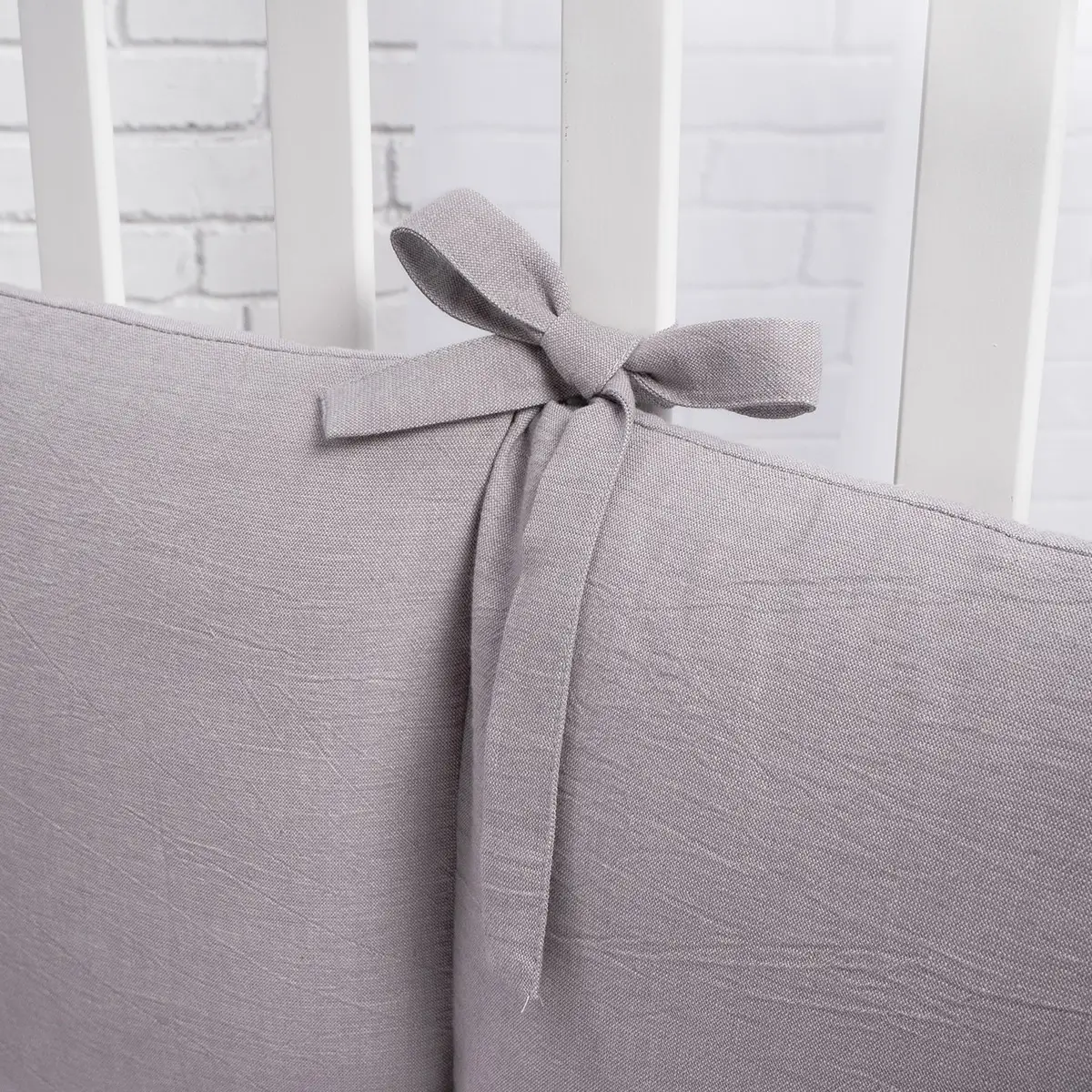 Все элементы бортиков крепятся к кроватке при помощи прочно пришитых завязок. На концах завязок стоят закрепляющие швы, благодаря чему они не разойдутся и прослужат долго. Кроме того, завязки добавляют бортикам нежного изящества.
