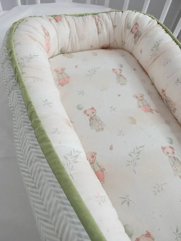 Кокон создан для комфорта и безопасности вашего ребёнка. В нём малыш чувствует себя максимально уютно. Ребёнок спокойно засыпает в кроватке с маятником, на руках у мамы или в постели родителей. Гнездо изготовлено из высококачественного поплина европейского производства и украшено оригинальным дизайном. Сначала его используют с завязанными бортиками, а после их развязывания и раскладывания получается матрасик для пеленального столика размером 100х60 см.