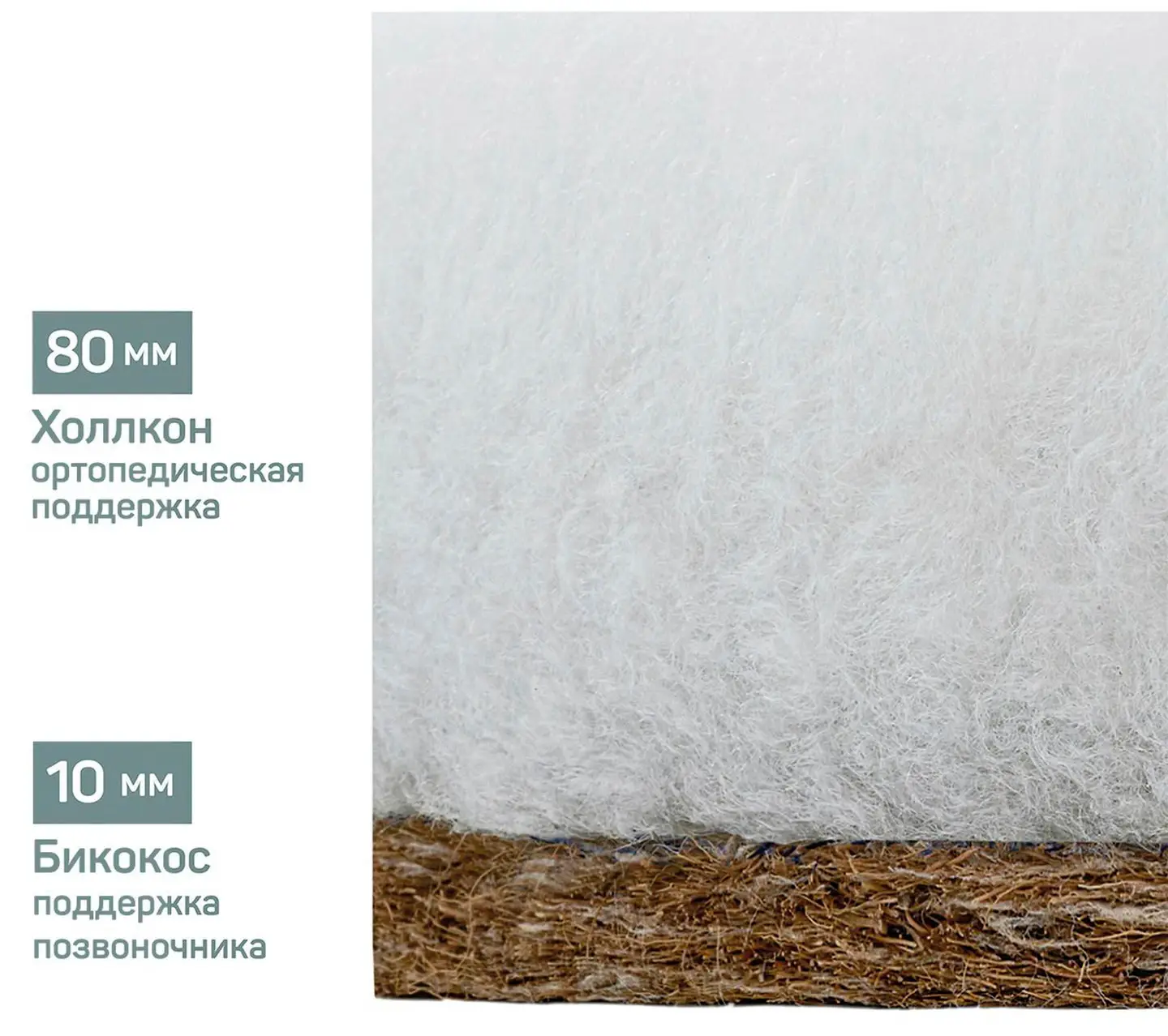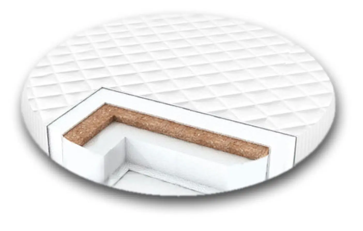 - кокосовая койра – 100% натуральный материал, состоящий из волокон кокосового ореха, скрепленных натуральным латексом – вспененным соком каучукового дерева. Это один из самых упругих и эластичных наполнителей. Он идеально поддерживает позвоночник крохи во время сна, занимая лидирующую позицию среду наполнителей любых матрасов. Обладает потрясающими антиаллергенными и бактерицидными свойствами, поскольку кокосовое волокно не гниет ни при какой влажности;