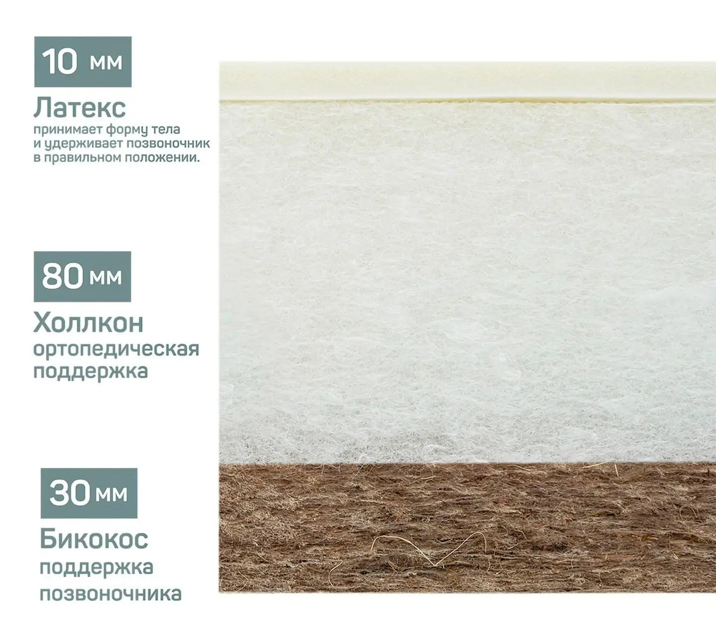 - кокосовая койра – 100% натуральный материал, состоящий из волокон кокосового ореха, скрепленных натуральным латексом - вспененным соком каучукового дерева. Обладает потрясающими антиаллергенными и бактерицидными свойствами, поскольку кокосовое волокно не гниет ни при какой влажности. Один из самых жестких, упругих и эластичных наполнителей, он идеально поддерживает позвоночник маленького ребенка во время сна. Кокосовая койра не деформируется в течение многих лет и обеспечивает отличную циркуляцию воздуха и теплообмен. Среди жёстких наполнителей матрасов она занимает лидирующую позицию;