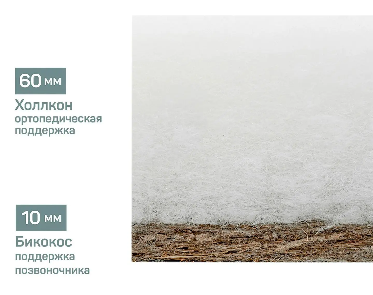 - 100% натуральный материл кокосовая койра – один из самых упругих и эластичных наполнителей. Он идеально поддерживает позвоночник крохи во время сна, занимая лидирующую позицию среду наполнителей любых матрасов; обладает потрясающими антиаллергенными и бактерицидными свойствами, поскольку кокосовое волокно не гниет ни при какой влажности.
