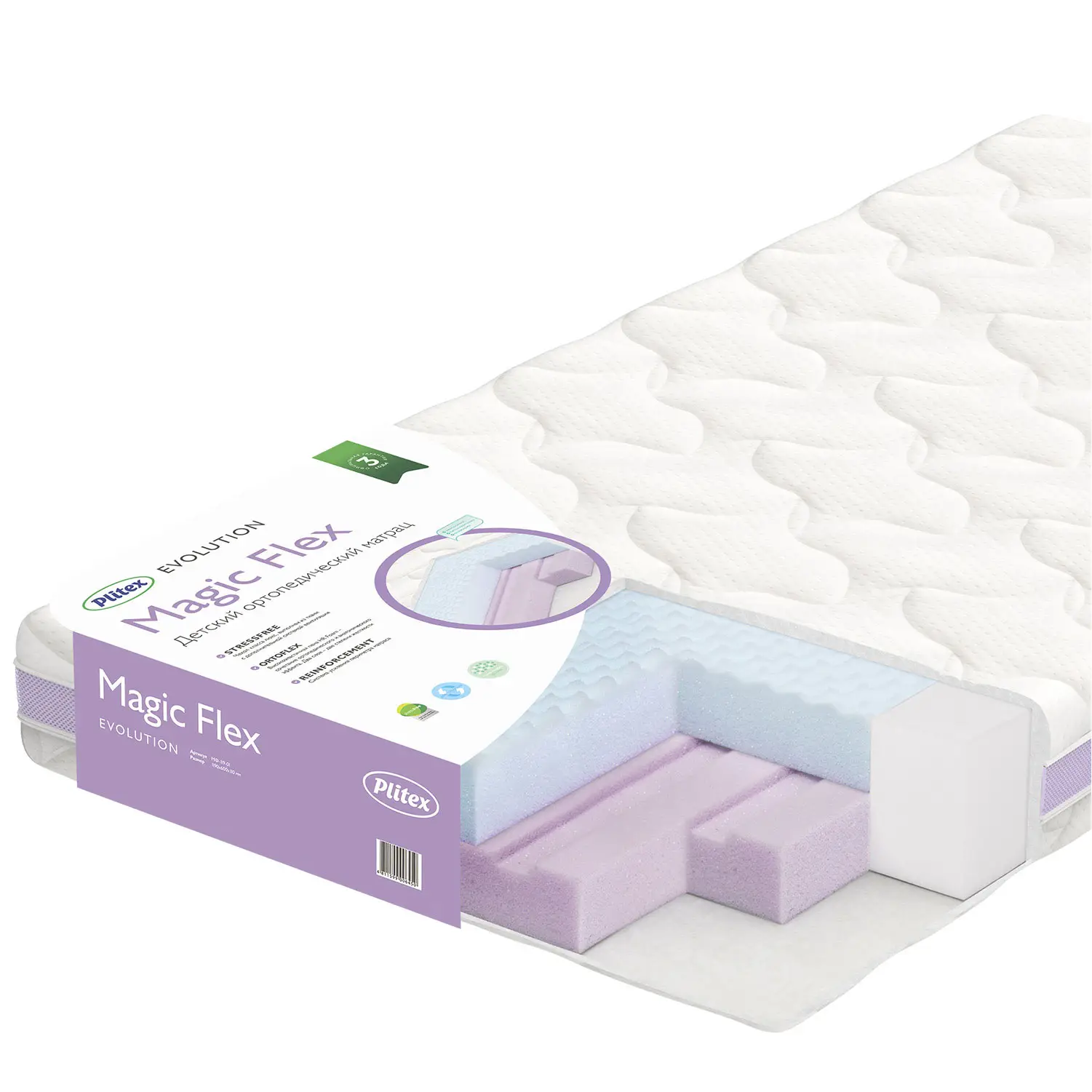 Ортопедический беспружинный двусторонний матрас для детей от рождения до 3-4 лет. Модель повышенной комфортности на основе уникальной высокоэластичной пены.