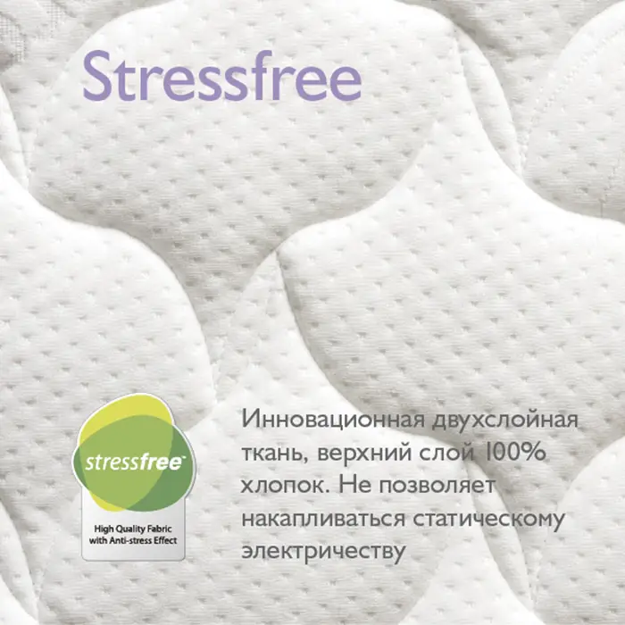 Упругие пенополиуретановые блоки усиливают периметр матраса. Прочный инновационный трикотажный материал StressFree, используемый для чехла, поможет забыть о проблеме статического электричества. 3D-сетка по периметру чехла обеспечивает дополнительную вентиляцию наполнителей.