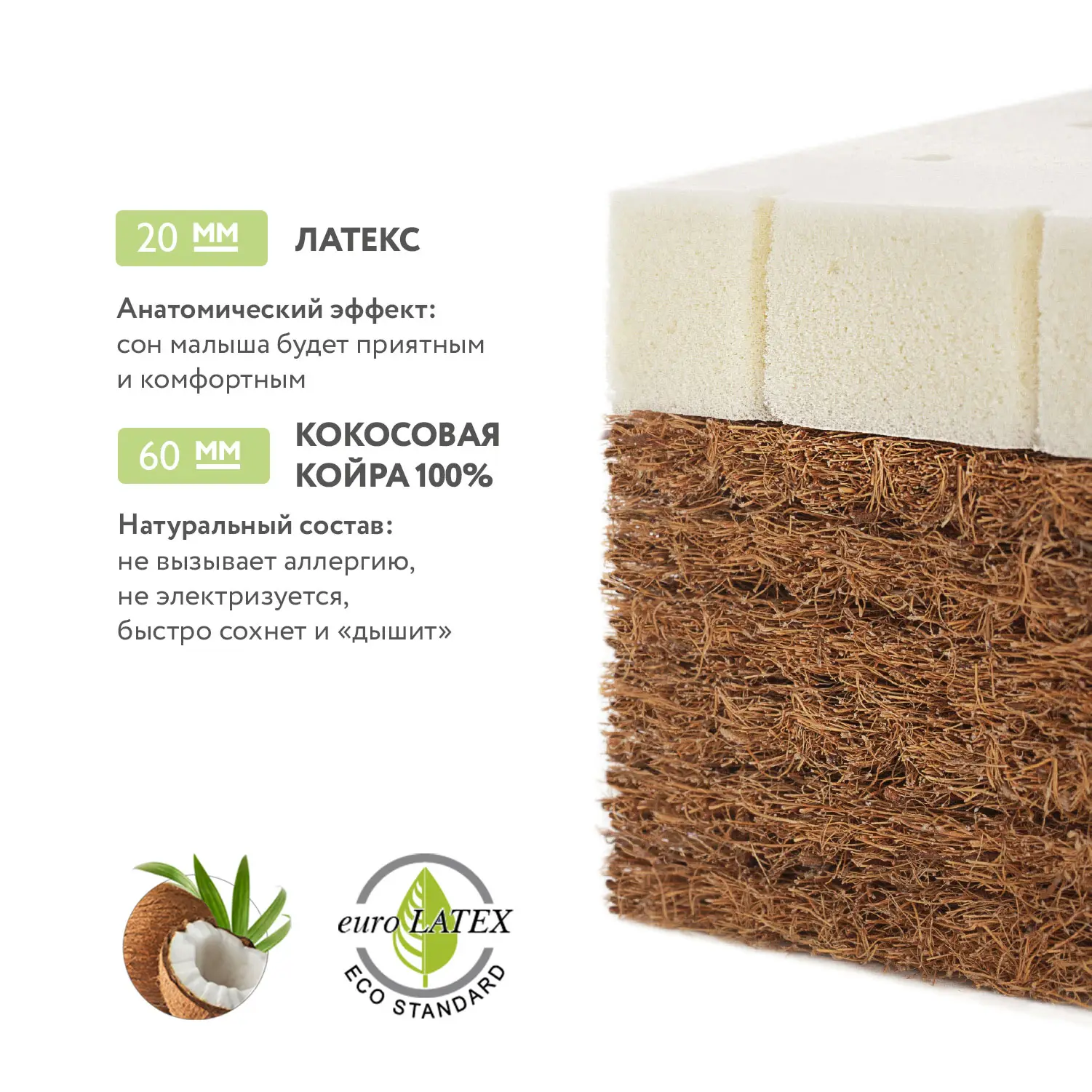 Плотная кокосовая койра обеспечивает надёжную поддержку формирующегося позвоночника новорождённого, а латекс благодаря способности подстраиваться под форму тела распределяет нагрузку и дарит дополнительный комфорт.