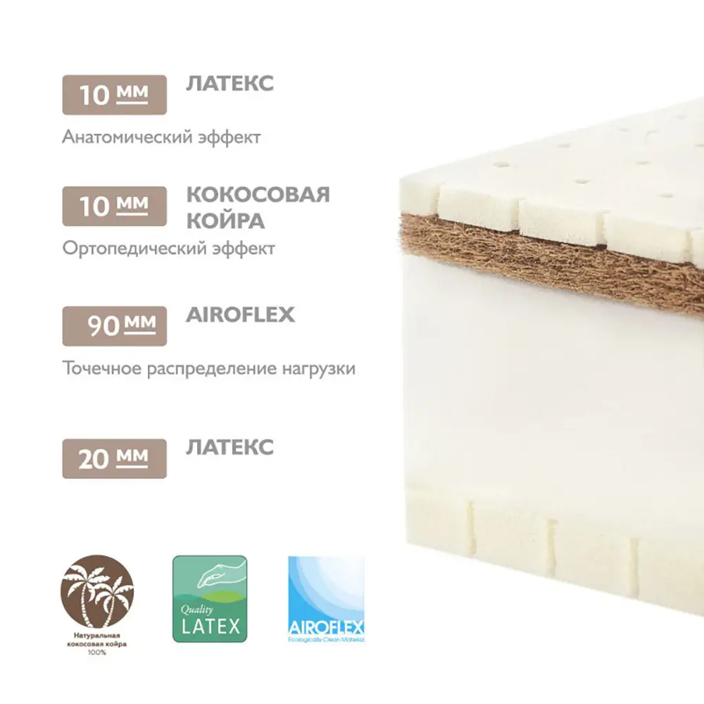Натуральный латекс с одной стороны 10 мм создаёт точечное распределения нагрузки и позволяет телу расслабиться во время сна. При этом упругая поверхность поддерживает тело в правильном положении.