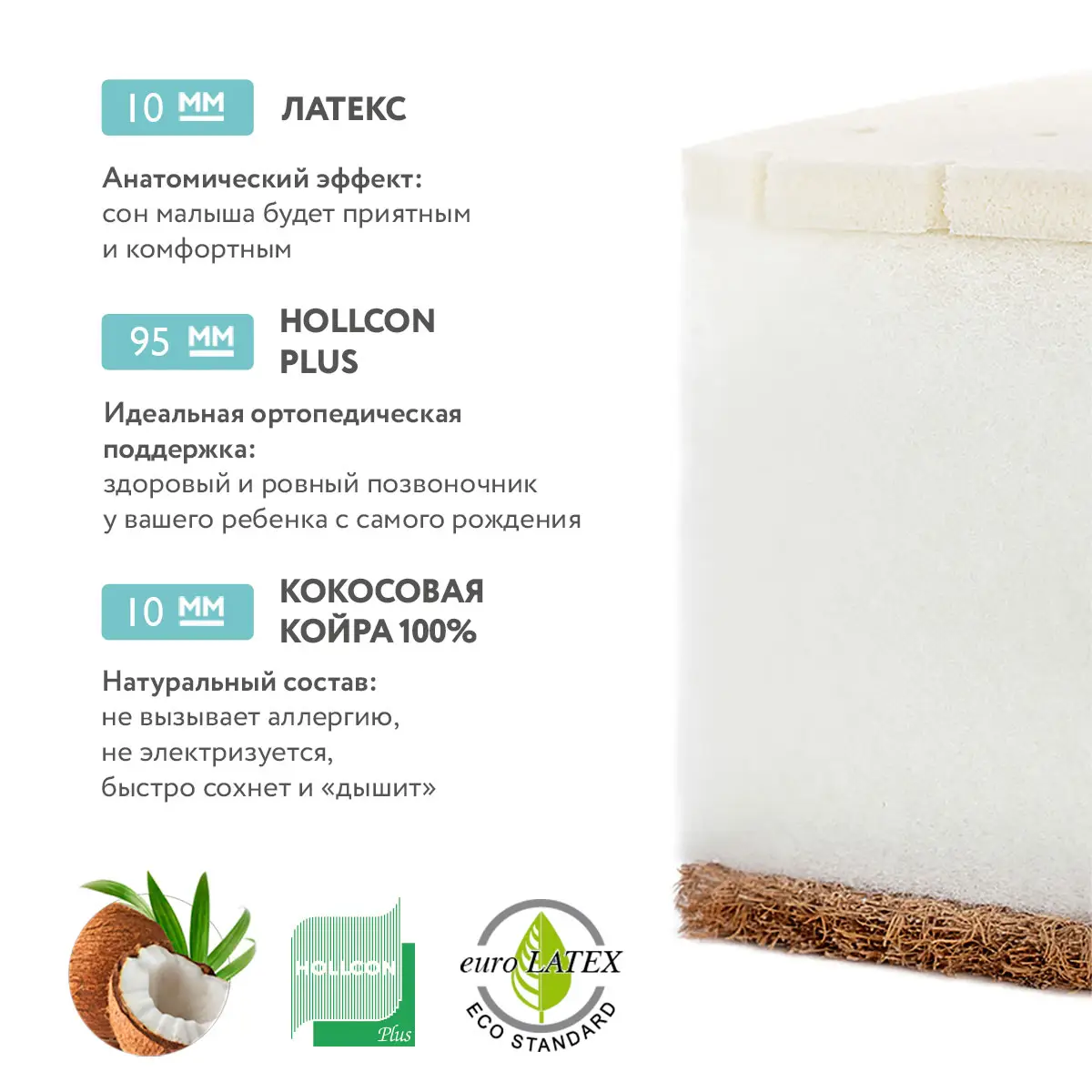 Здоровый сон ребёнка имеет важную особенность: в первые месяцы позвоночник новорожденного продолжает формироваться и ему нужна надежная поддержка. Беспружинный ортопедический матрас имеет две стороны разной жёсткости. Сторона с кокосовой койрой обеспечивает жёсткую поддержку позвоночника с самого рождения, а на второй стороне расположен эластичный латекс для комфортного сна ребенка от 6-ти месяцев. В основе матраса Hollcon Plus – экологически чистый материал нового поколения. Благодаря вертикальной укладке волокон материал лучше восстанавливает форму по сравнению с другими наполнителями. Адаптируется под контуры тела, прекрасно вентилируется.