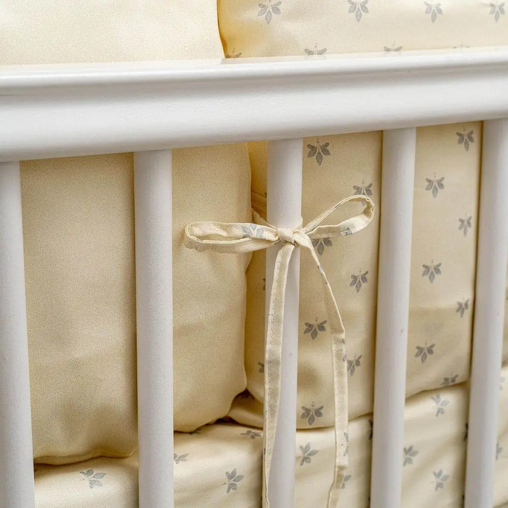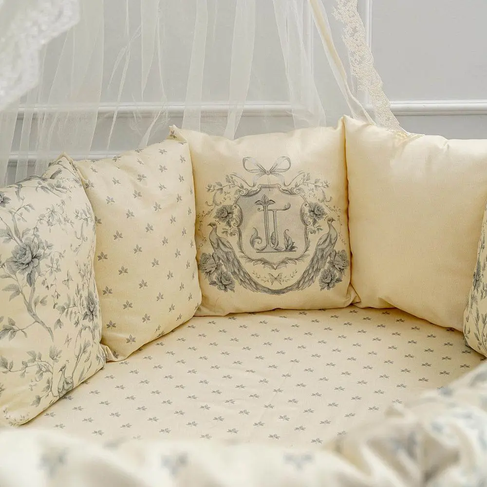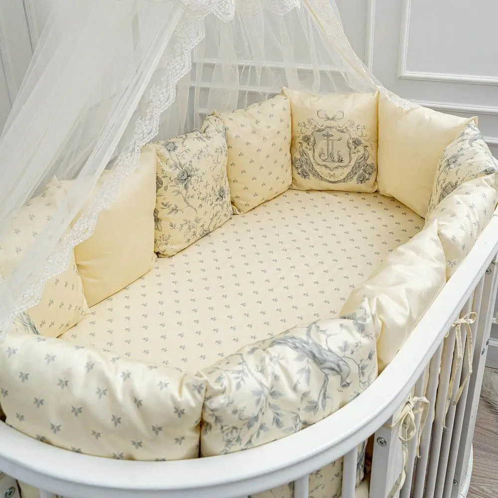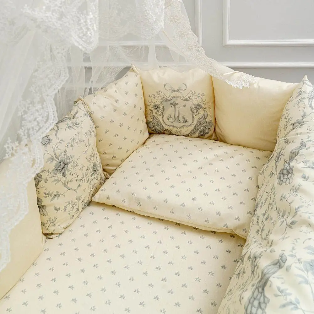 Комплект "Райский сад" для детской кроватки выполнен в традиционном стиле. Благодаря сочетанию кремового цвета и оттенка грозового неба, этот комплект выглядит роскошно. Он изготовлен из высококачественного сатина с уникальным дизайном.