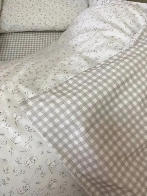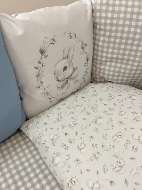 Комплект Кролик Лаппин для круглой, овальной и прямоугольной кроватки, выполнен в сдержанных тонах с использование ткани поплина и сатина, с вышивкой на подушечках с длинноухим, любопытным кроликом.