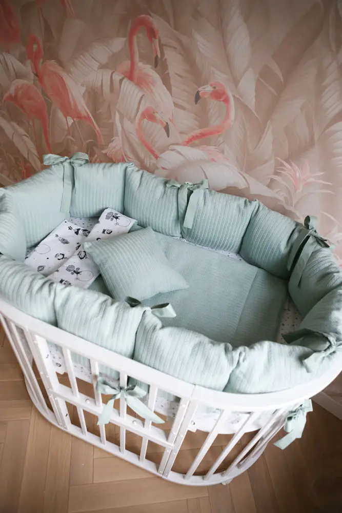 Комплект Vintage в кроватку от бренда Peppy с универсальными бортиками состоит из 6 предметов и рассчитан на кроватки с габаритами спального места 120х60 см. По краям ребёнка защищает бортик, состоящий из 12 подушек со съёмными чехлами.