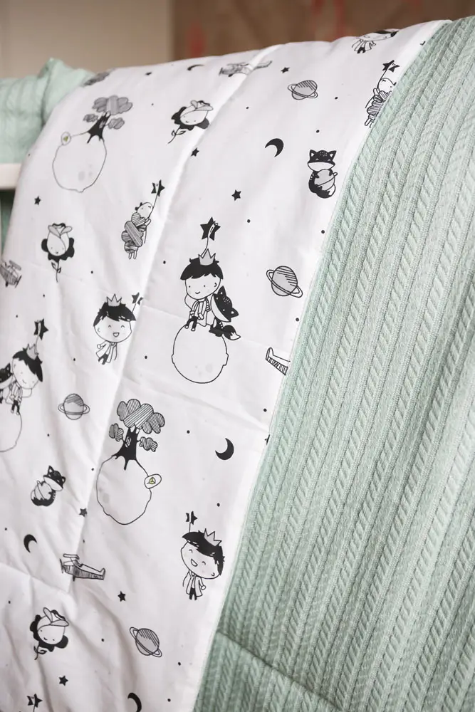Детское постельное белье выполнено из хлопка, имеющего хорошую воздухопроницаемость и гладкую поверхность. Ткань украшена красивым рисунком. Наполнитель – синтепух.