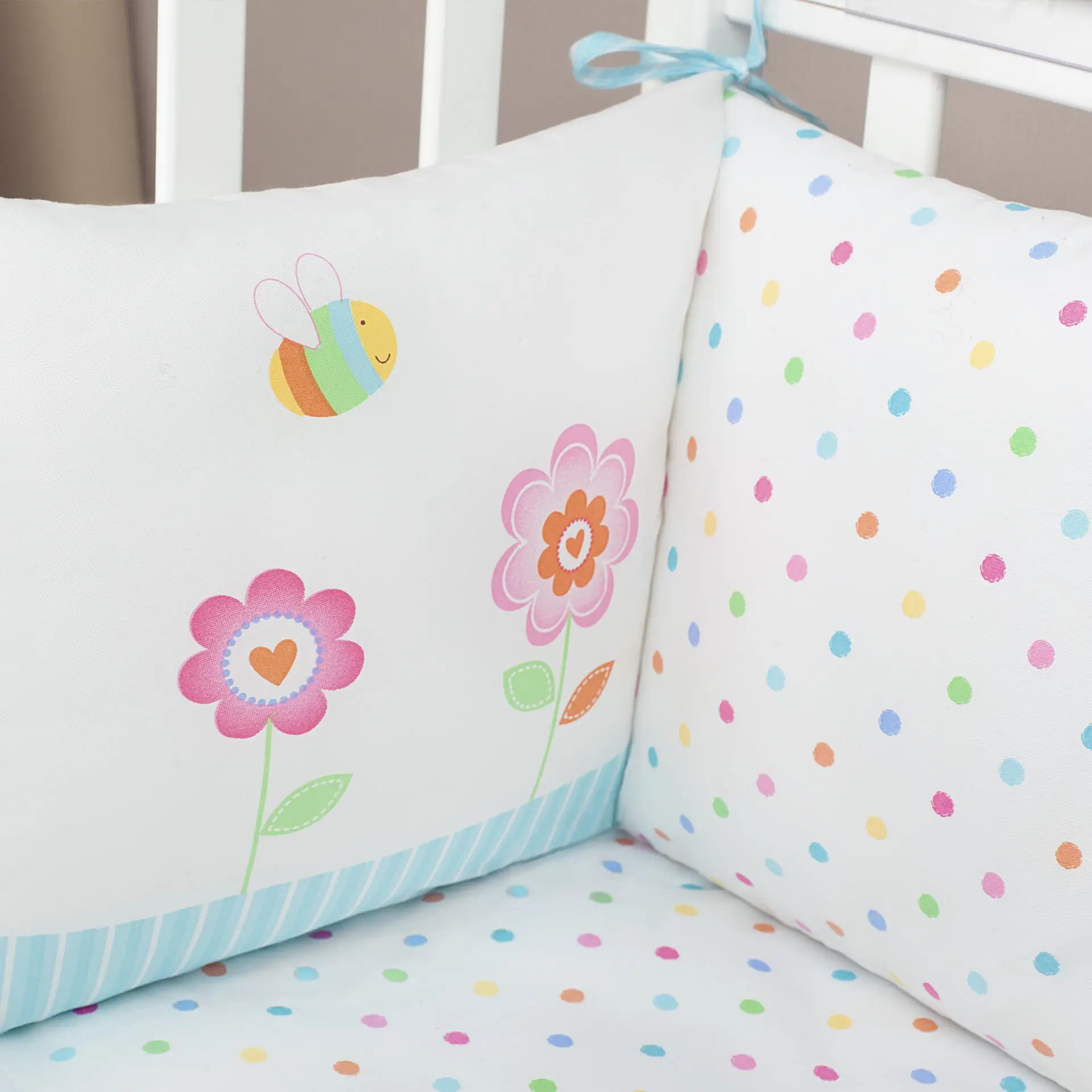 - бампер состоит из полуборта и дополнительных 3 подушечек – для защиты кроватки со всех сторон;