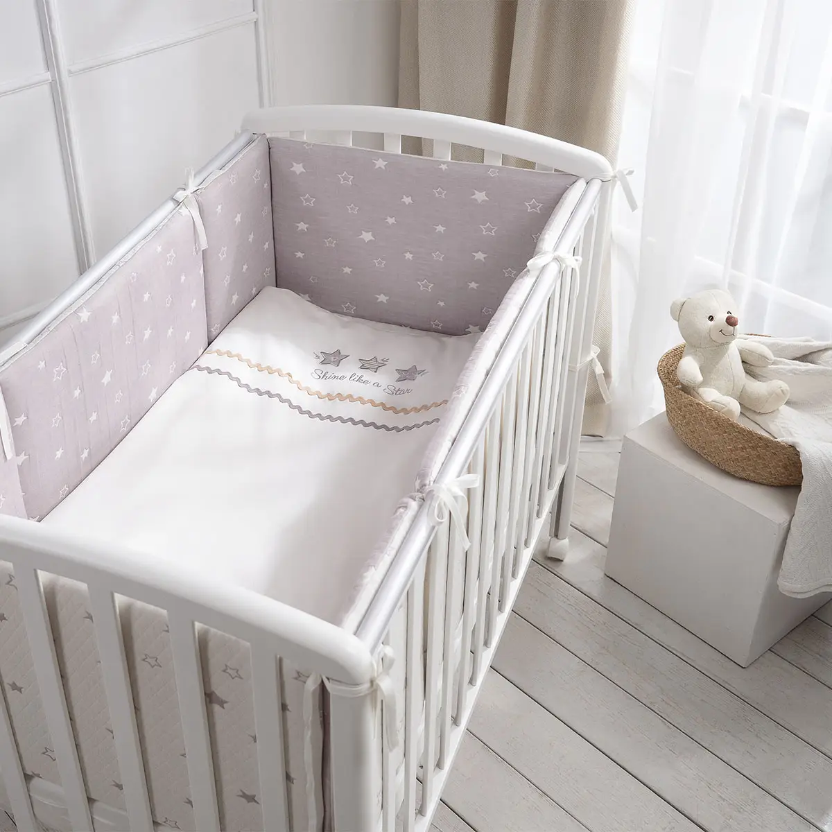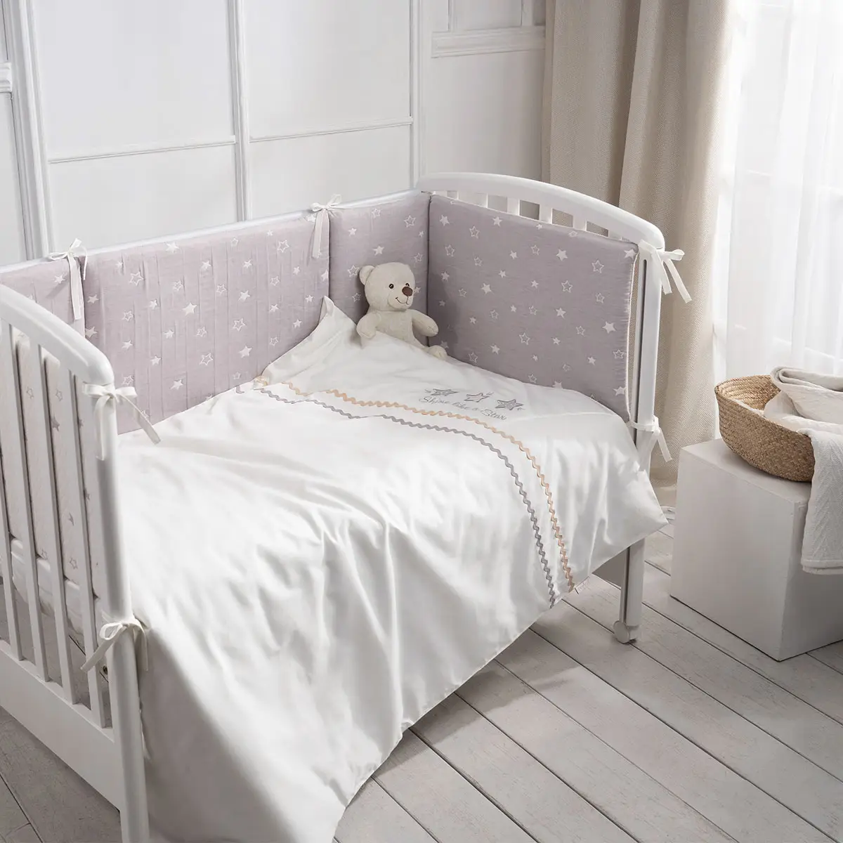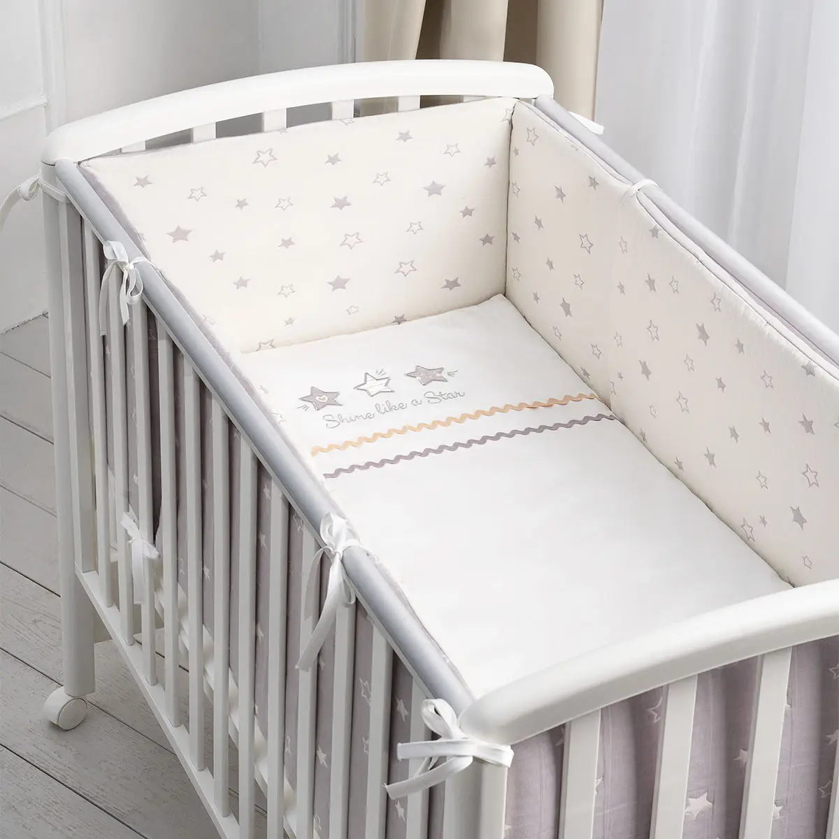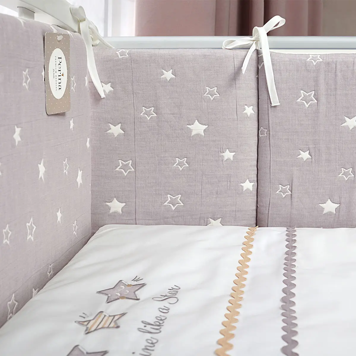 Комплект в кроватку Perina состоит из 6 предметов. Набор пошит из нежного и мягкого на ощупь сатина с эффектом шёлка и украшен вышивкой. Защитный бампер имеет съёмный чехол и наполнен экологически чистым и гипоаллергенным холлконом, а одеяло и подушка – эвкалиптовым волокном. Простынь оснащена резинкой, поэтому она не будет скатываться на кровати. В пододеяльнике вместо традиционных прорезей применяется молния-застёжка, отличающаяся удобством в применении и позволяющая дольше сохранить его форму.