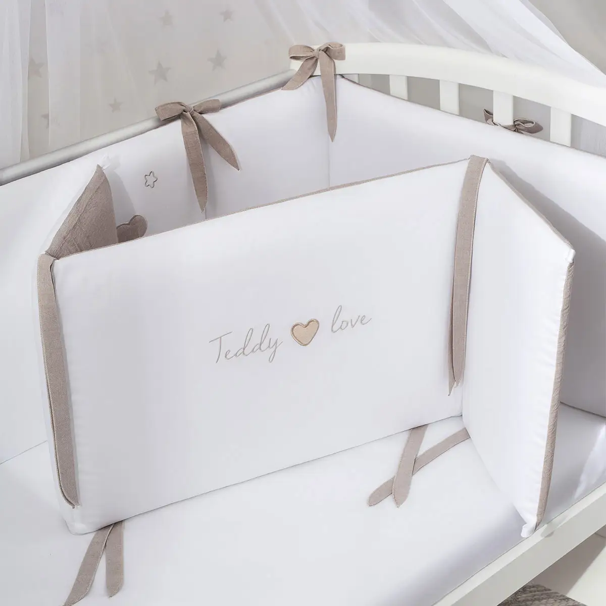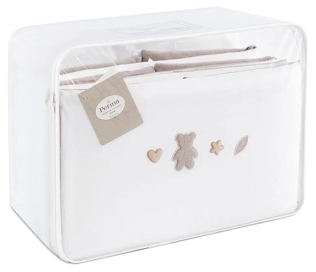 Комплект Teddy Love от бренда Perina выглядит нежным, почти невесомым, при этом каждая деталь в нем надёжно пришита и продумана с точки зрения практичности. Составные бортики в съёмных чехлах на завязках упрощают уход за бельём, пододеяльник на молнии удобно снимать и надевать, а простыня на резинке легко крепится и разглаживается.