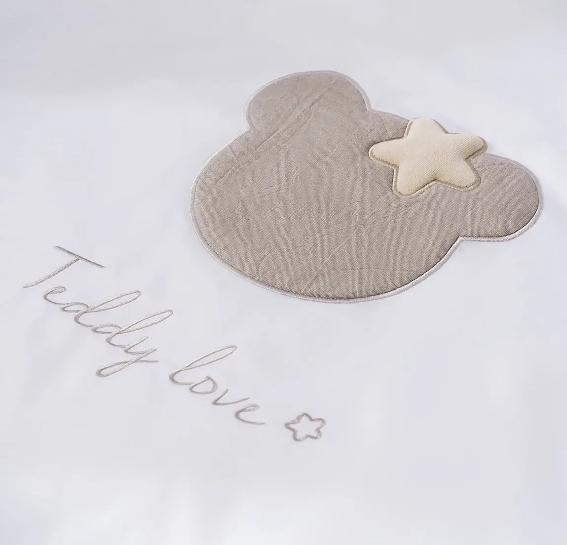 Основной цвет модели – белый, он создает воздушное настроение и не будет отвлекать ребенка перед сном. Но и скучать не придется, ведь на пододеяльнике и бортиках мы сделали объёмные натуральные аппликации-мишек. Проверено: они совершенно не мешают спать, зато после пробуждения малышу будет интересно их рассматривать и трогать. Приятный на ощупь мягкий хлопок к этому точно располагает!