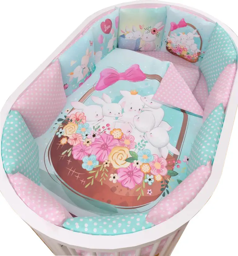 Комплект детского постельного белья состоит из 17 предметов. Бортики представлены в виде 12-ти подушек на завязках, наволочки на бортиках съёмные. Мягкий наполнитель бортиков обезопасит сон вашего малыша. Мягкая ткань не раздражает чувствительную и нежную кожу ребёнка и приятна на ощупь. Постельное бельё не требует особого ухода и долго сохраняет первоначальный внешний вид. Наполнитель - термофайбер. Предназначен для кроватки овальной, круглой и прямоугольной формы.