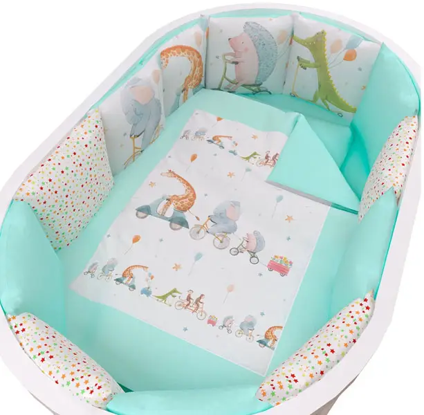 Комплект детского постельного белья состоит из 17 предметов. Бортики представлены в виде 12-ти подушек на завязках, наволочки на бортиках съёмные. Мягкий наполнитель бортиков обезопасит сон вашего малыша. Мягкая ткань не раздражает чувствительную и нежную кожу ребёнка и приятна на ощупь. Постельное бельё не требует особого ухода и долго сохраняет первоначальный внешний вид. Предназначен для кроватки овальной, круглой и прямоугольной формы.