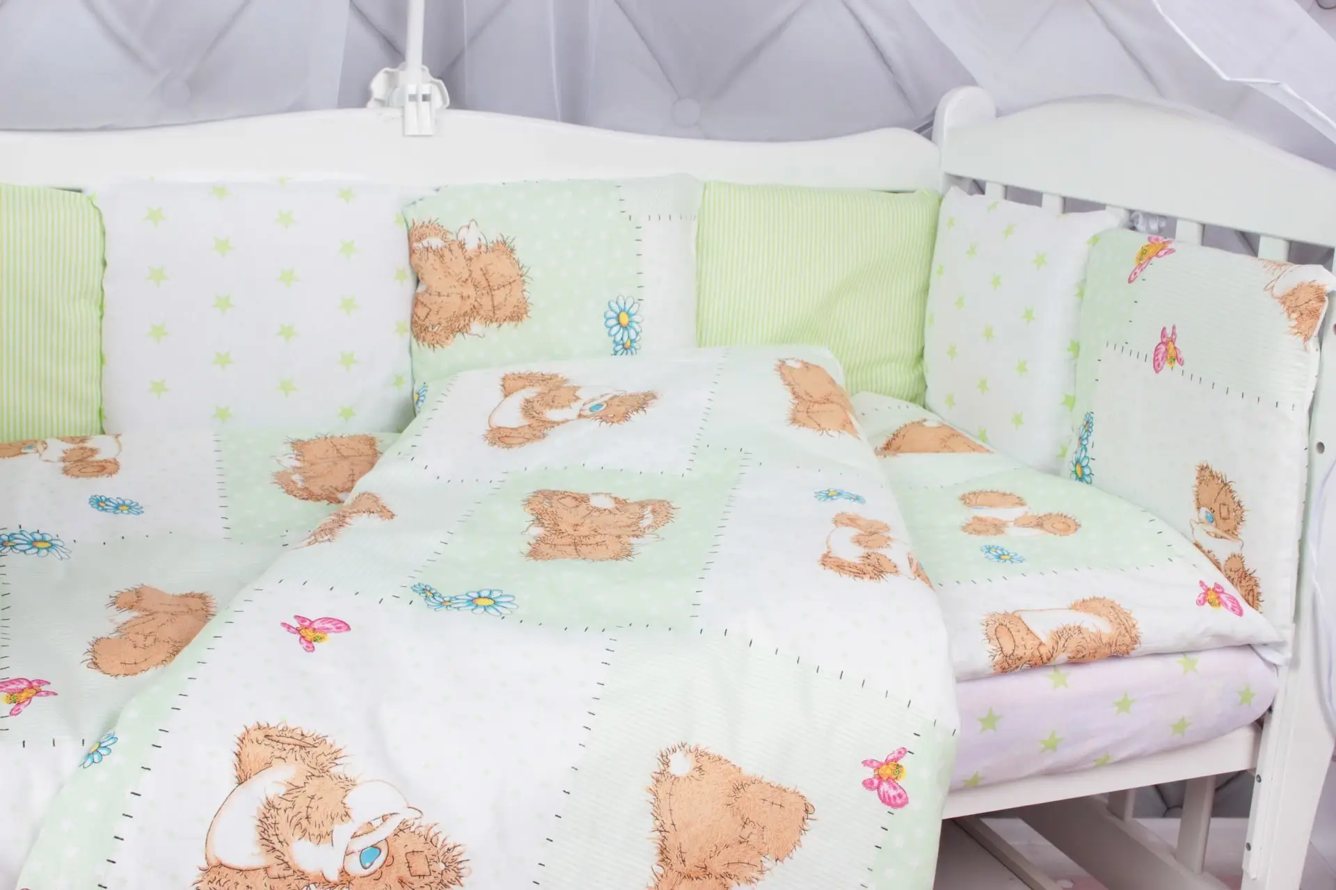 Комплект в кроватку 18 предметов (6+12 подушек-бортиков) AmaroBaby Мишка зелёный
