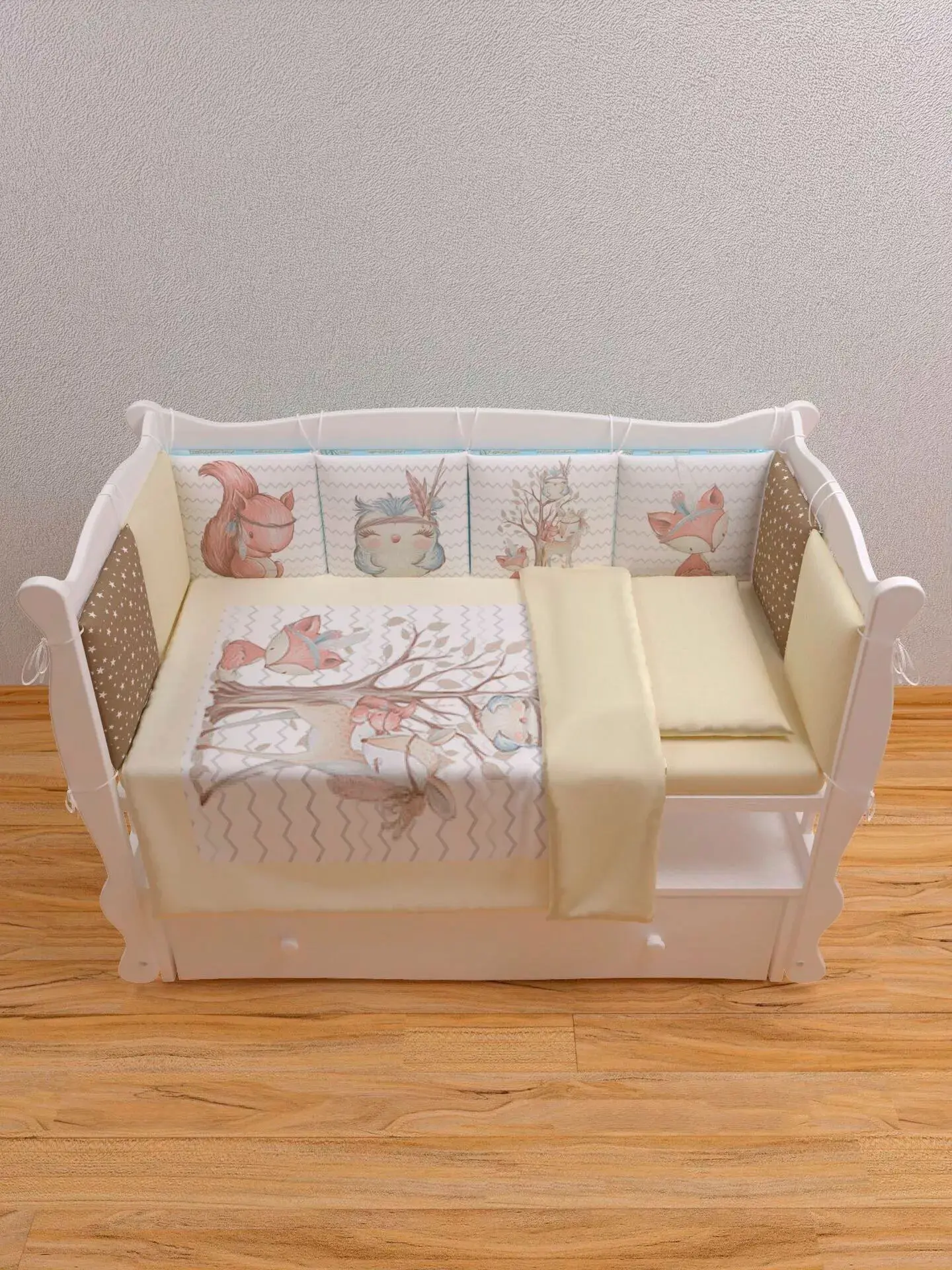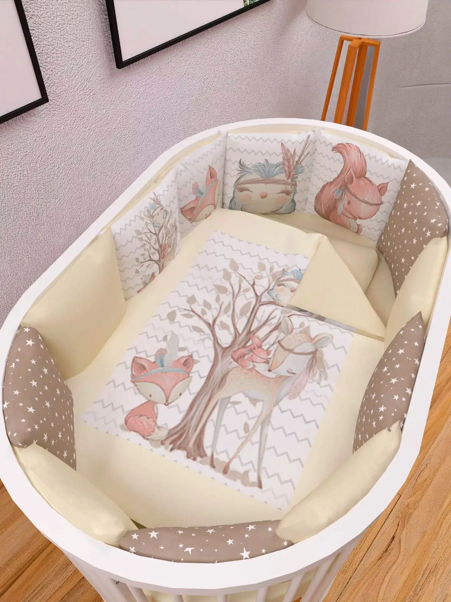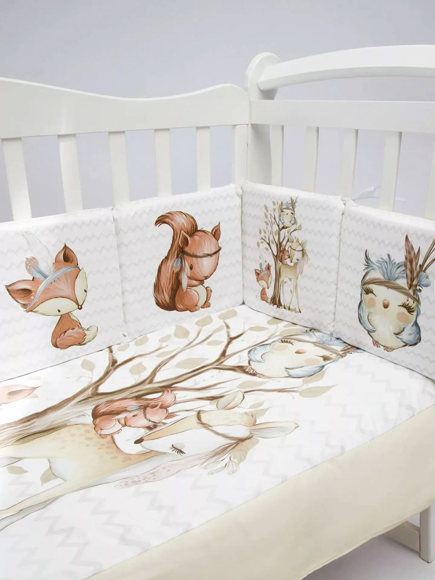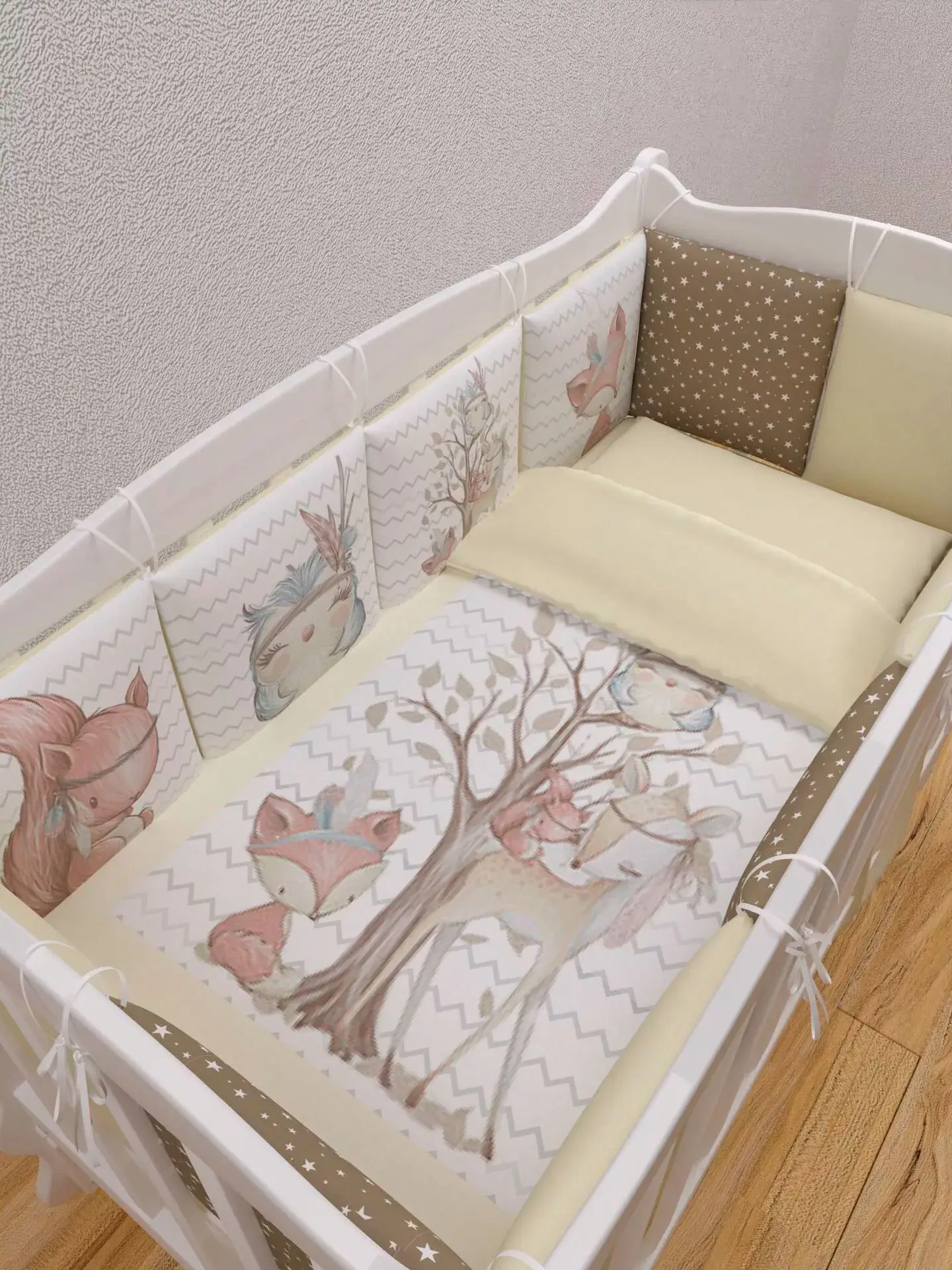 Бортики представлены в виде 12ти подушек на завязках, наволочки на бортиках съёмные. Мягкий наполнитель бортиков обезопасит сон вашего малыша.
