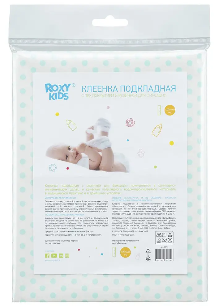 Клеёнка подкладная с резинками-держателями удобно крепится к детским матрасам с помощью резинок-держателей. Изделия Roxy-Kids производятся из специальной медицинской клеёнки с ПВХ-покрытием. Все клеёнки имеют окантовку по периметру. Они обладают отличной теплопроводностью. Специальный покрывающий слой на основе поливинилхлорида делает поверхность пеленок удобной и комфортной – она быстро приобретает температуру человеческого тела. Отсутствует так называемый «эффект холодного прикосновения», что очень важно в педиатрии. Микропористая структура данного покрытия придает клеёнке свойства газопроницаемости.
