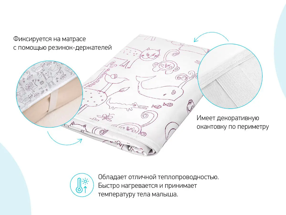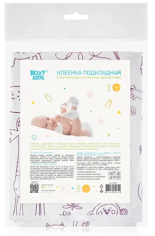 Удобно крепится к детским матрасам с помощью резинок-держателей. Изделия ROXY-KIDS производятся из специальной медицинской клеенки с ПВХ-покрытием. Все клеенки имеют окантовку по периметру. Они обладают отличной теплопроводностью. Специальный покрывающий слой на основе поливинилхлорида делает поверхность пеленок удобной и комфортной - она быстро приобретает температуру человеческого тела. Отсутствует эффект холодного прикосновения, что очень важно в педиатрии. Микропористая структура данного покрытия придает клеенке свойства газопроницаемости.