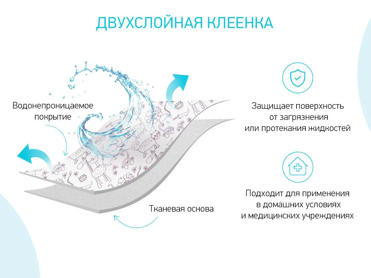 Подкладная клеенка с резинками-держателями защищает матрасы и любую другую поверхность от загрязнения или протекания жидкостей.