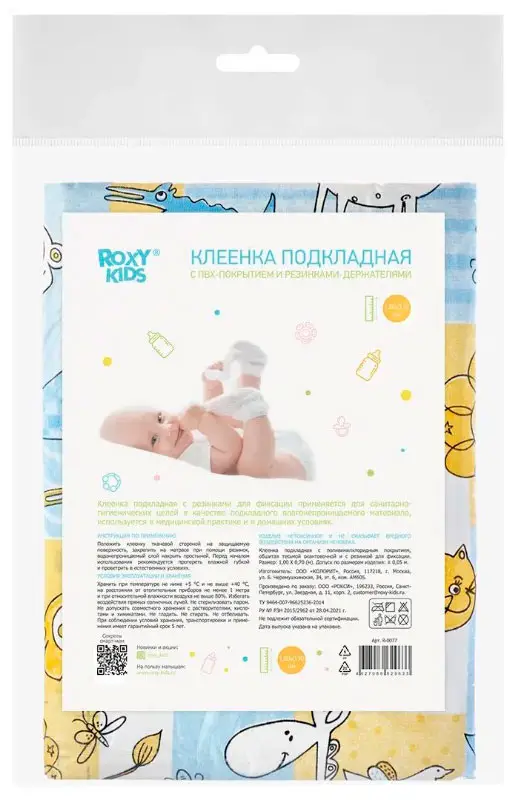 Удобно крепится к детским матрасам с помощью резинок-держателей. Изделия ROXY-KIDS производятся из специальной медицинской клеенки с ПВХ-покрытием. Все клеенки имеют окантовку по периметру. Они обладают отличной теплопроводностью. Специальный покрывающий слой на основе поливинилхлорида делает поверхность пеленок удобной и комфортной - она быстро приобретает температуру человеческого тела. Отсутствует эффект холодного прикосновения, что очень важно в педиатрии. Микропористая структура данного покрытия придает клеенке свойства газопроницаемости.