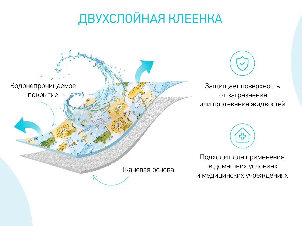 Подкладная клеенка с резинками-держателями защищает матрасы и любую другую поверхность от загрязнения или протекания жидкостей.