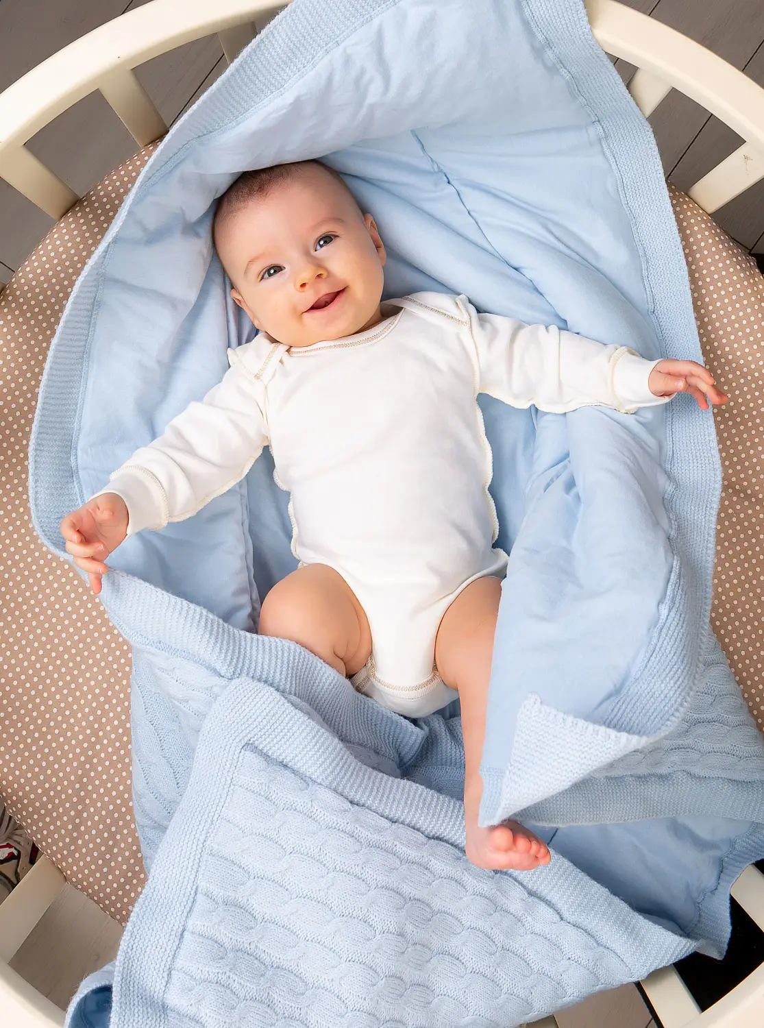 Одеяло-плед от бренда Осьминожка – мягкий, тёплый и очень прочный материал. Вязаное полотно сверху, с низу подклад – 100 % кулир, холкон наполнитель. Возьмите плед в дорогу, накройте малыша во время прогулки в коляске и используйте во время кормления.