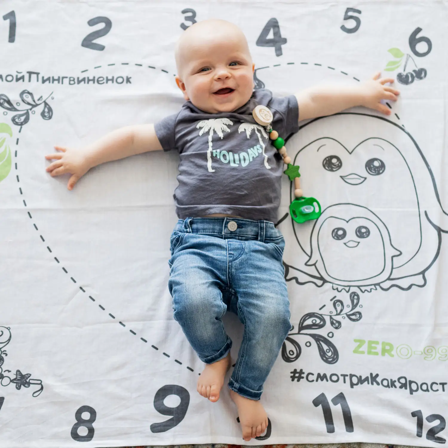 Простынка предназначена для фотокарточек малыша в его 1-12 дней, недель и месяцев. Она позволит визуально сравнить, как меняется малыш на фоне статичных элементов фона.