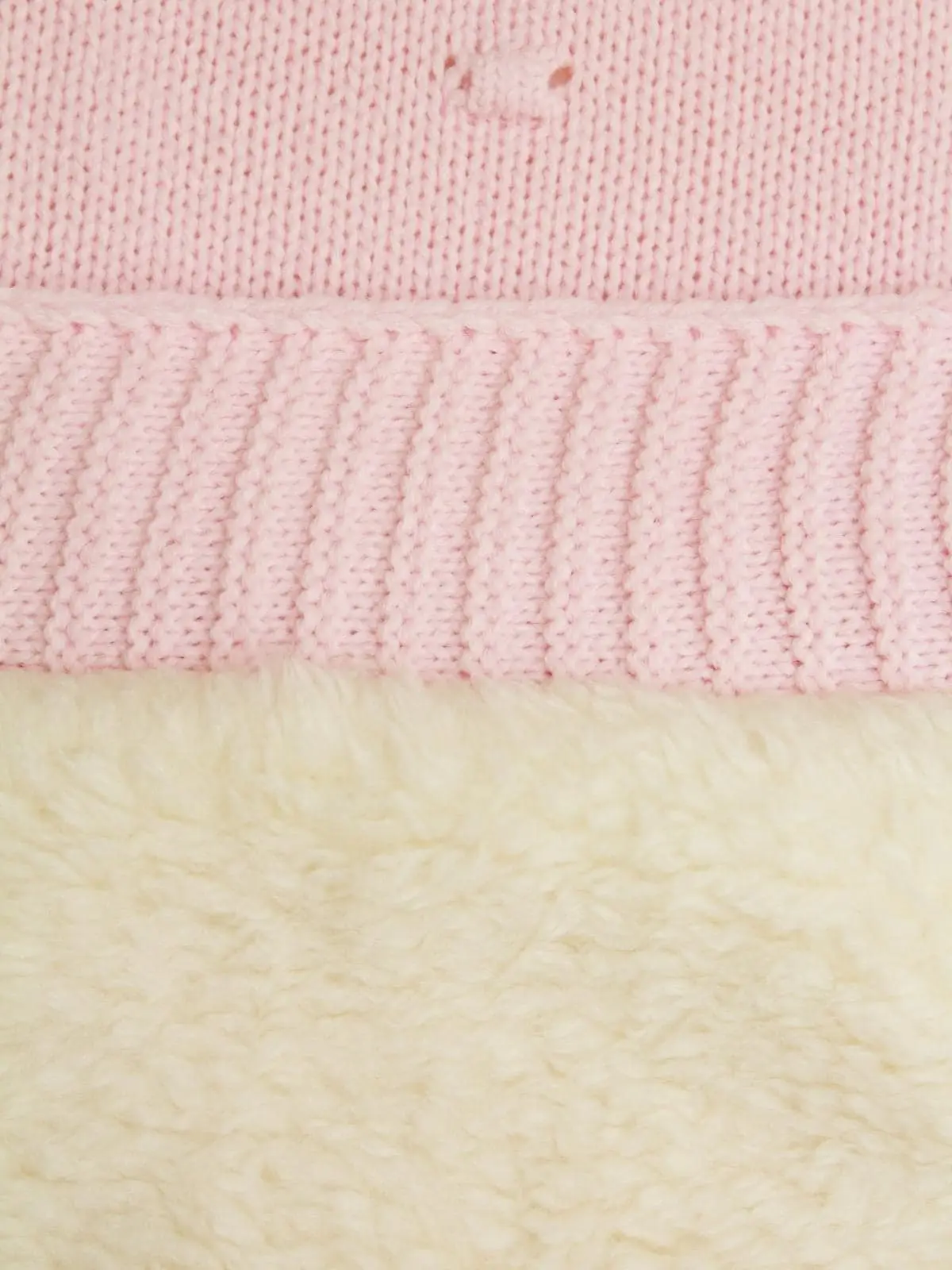 Вязаная сторона детского тёплого пледа украшена объёмными узорами. Плед долго будет сохранять свой вид, сначала в кроватке или коляске, а затем как коврик для игр.