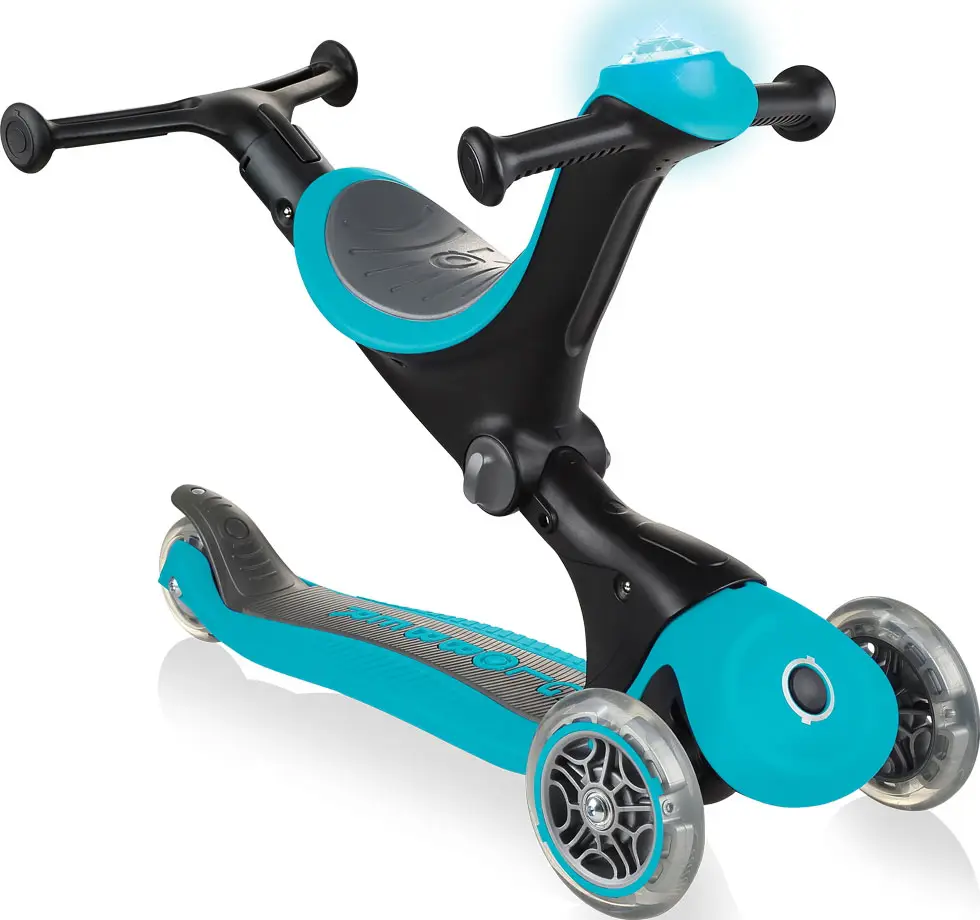 Globber Go Up Deluxe Play Lights – детский самокат/каталка который легко собрать или трансформировать для 3 режимов использования: детская каталка, беговел или самокат.