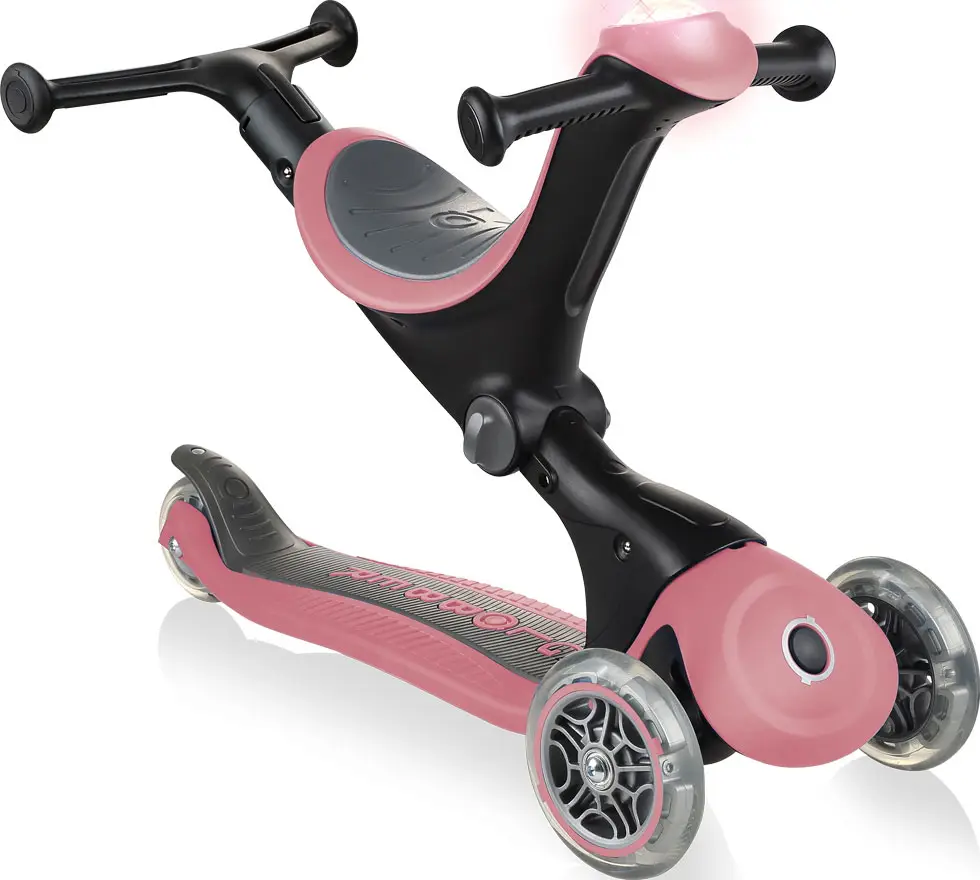 Globber Go Up Deluxe Play Lights – детский самокат/каталка который легко собрать или трансформировать для 3 режимов использования: детская каталка, беговел или самокат.