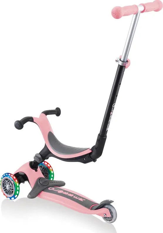 Globber Go Up Foldable Lights – стильный и практичный безвинтовой трансформер, который без дополнительных инструментов может превратиться в 3 разных средства передвижения: каталку, беговел и самокат.