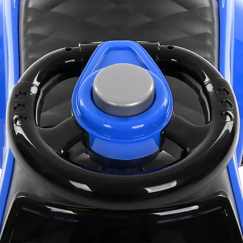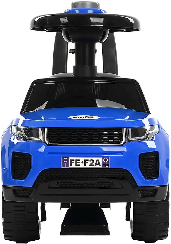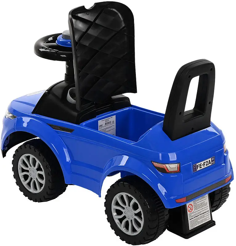 Модель выполнена имеет пластиковые колёса и просторное сиденье для комфортной посадки. На руле расположен клаксон. Под сиденьем есть вместительный отсек для хранения любимых игрушек. Специальный стопор сзади защитит каталку от опрокидывания.