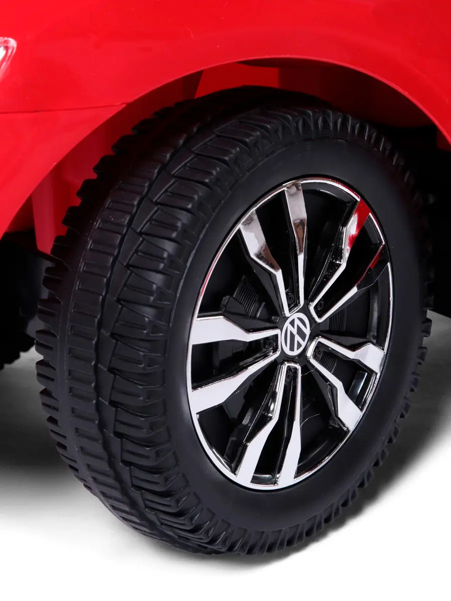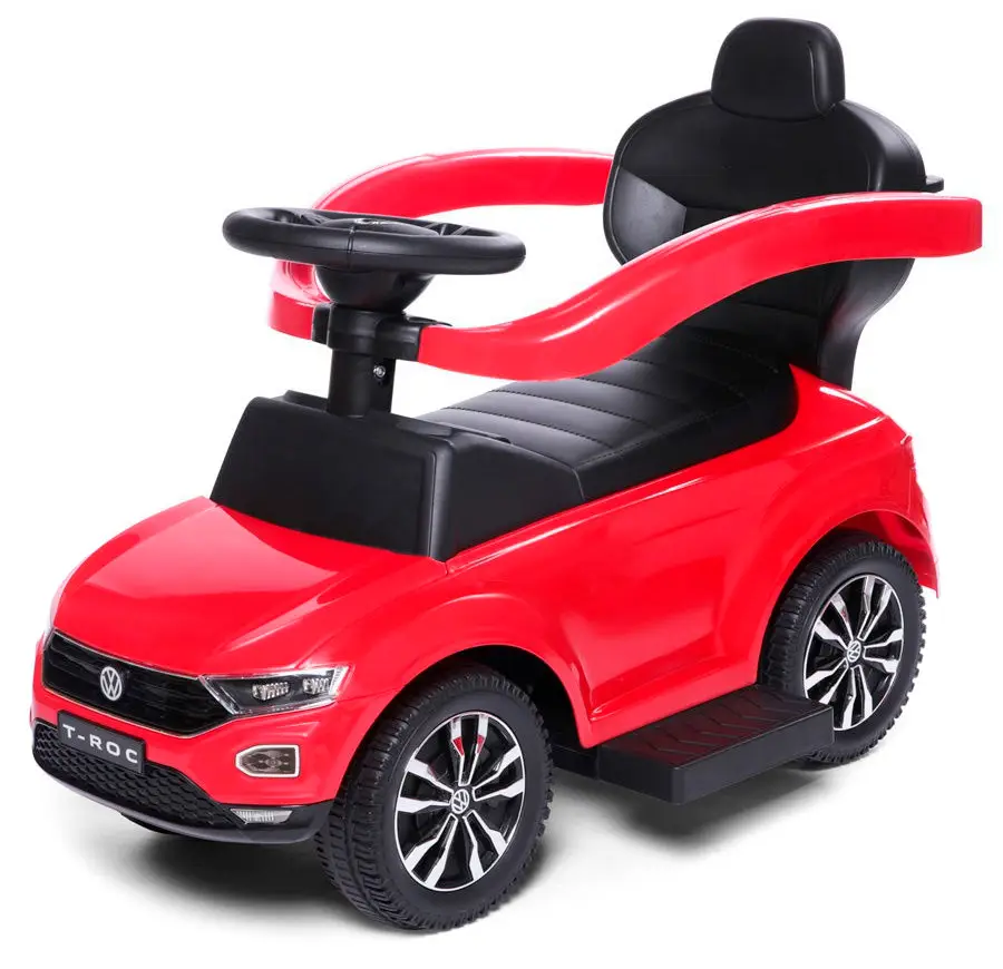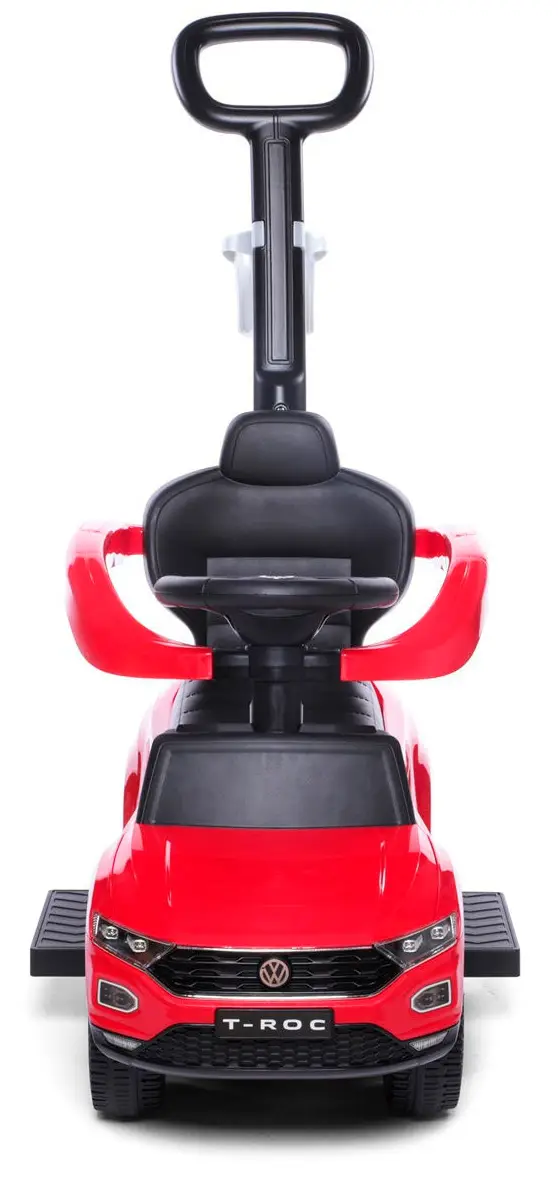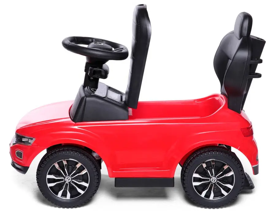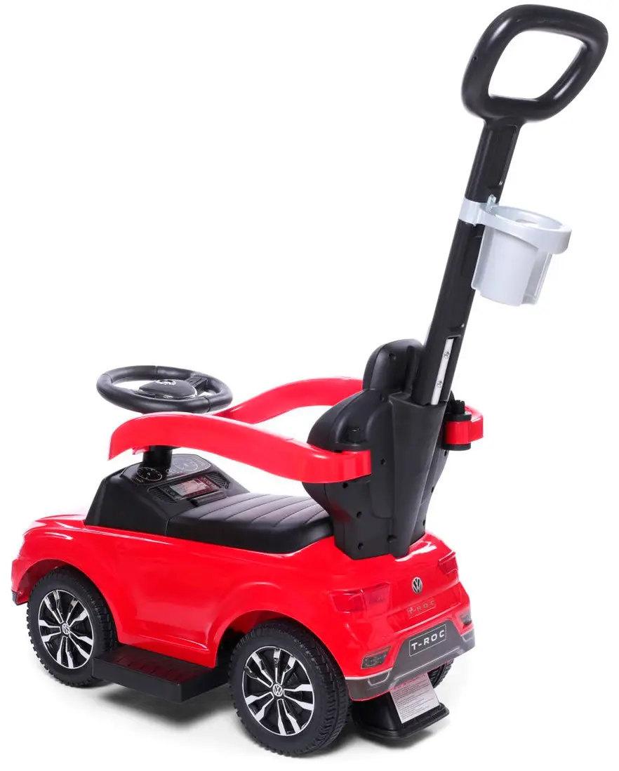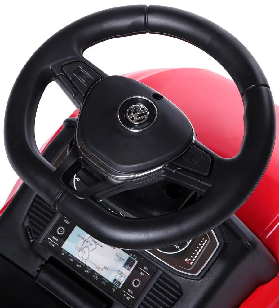 Черты автомобиля нашли свое отражение в игрушке – обтекаемый корпус, фары (без подсветки), радиаторная решетка и фирменная эмблема Volkswagen. Модель не имеет острых углов, выполнена из ударопрочного и гипоаллергенного пластика. Родительская ручка управляет передними колёсами, что позволяет поворачивать каталку в разные стороны без особых усилий.