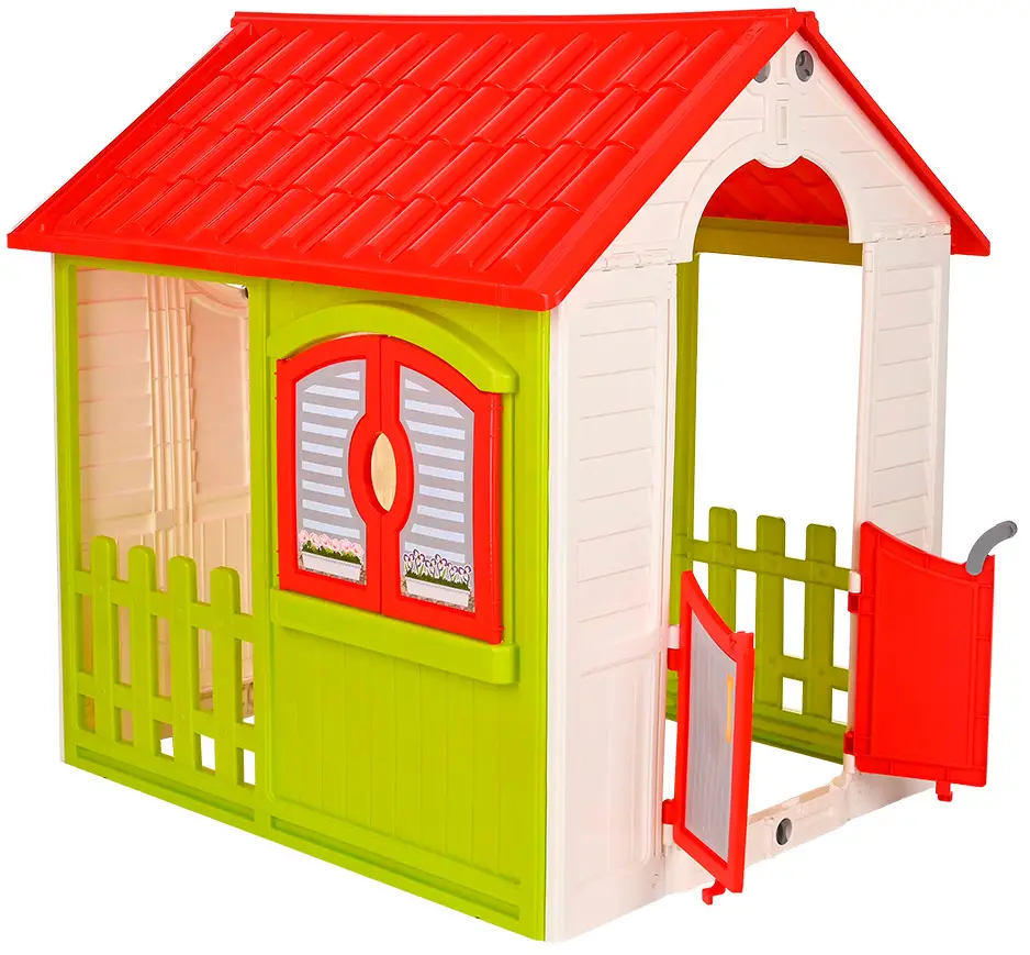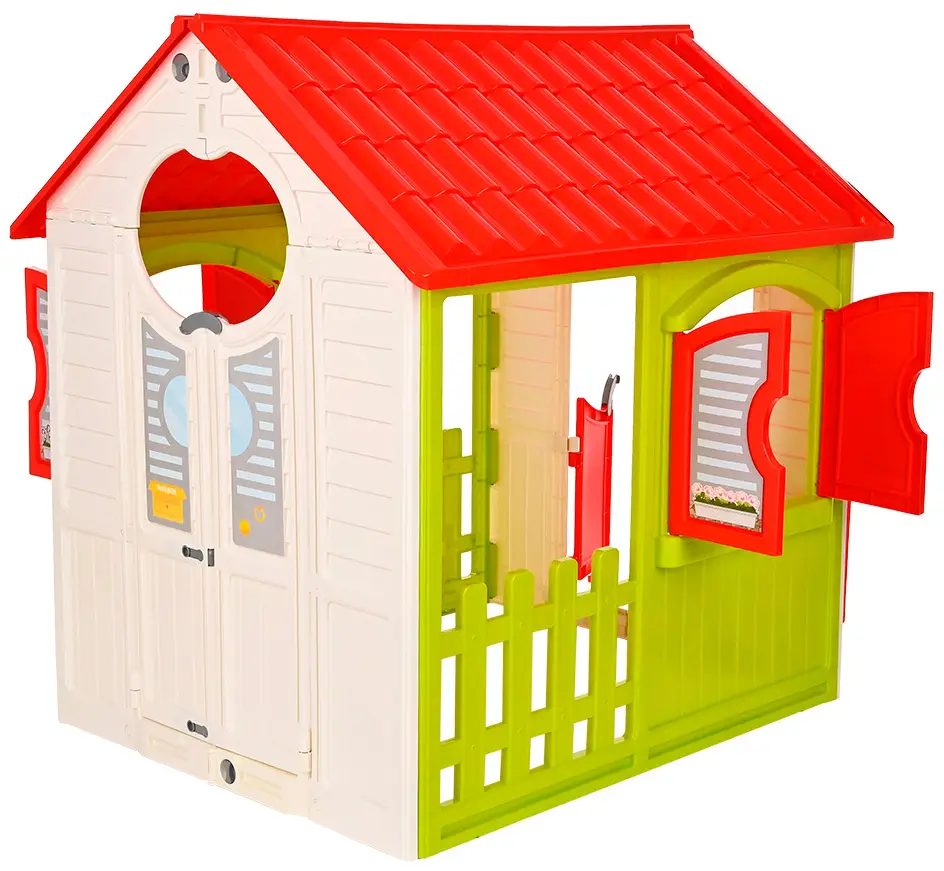 . Он состоит из одной комнаты, имеет низкую двойную дверцу, окошки со ставнями и крышу. При сборке домика элементы конструкции соединяются между собой при помощи специальных пазов, как конструктор. Материал, из которого выполнено изделие, устойчив к осадкам, низким температурами и солнечным лучам.