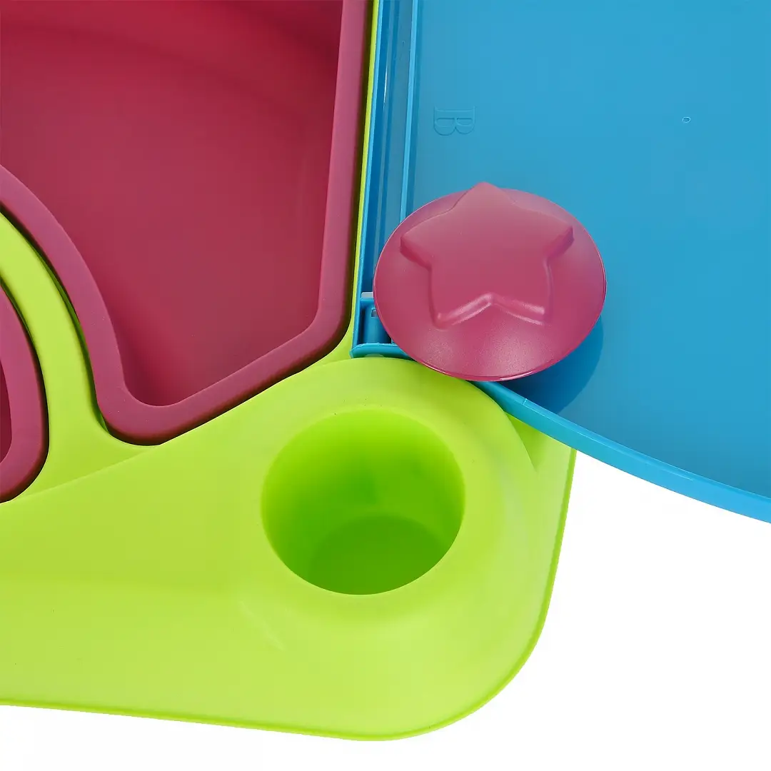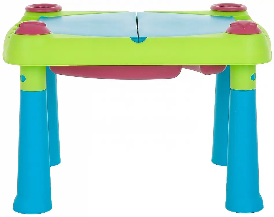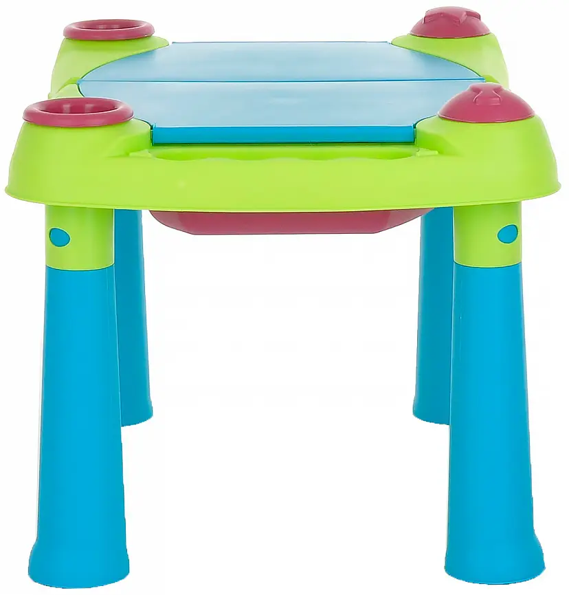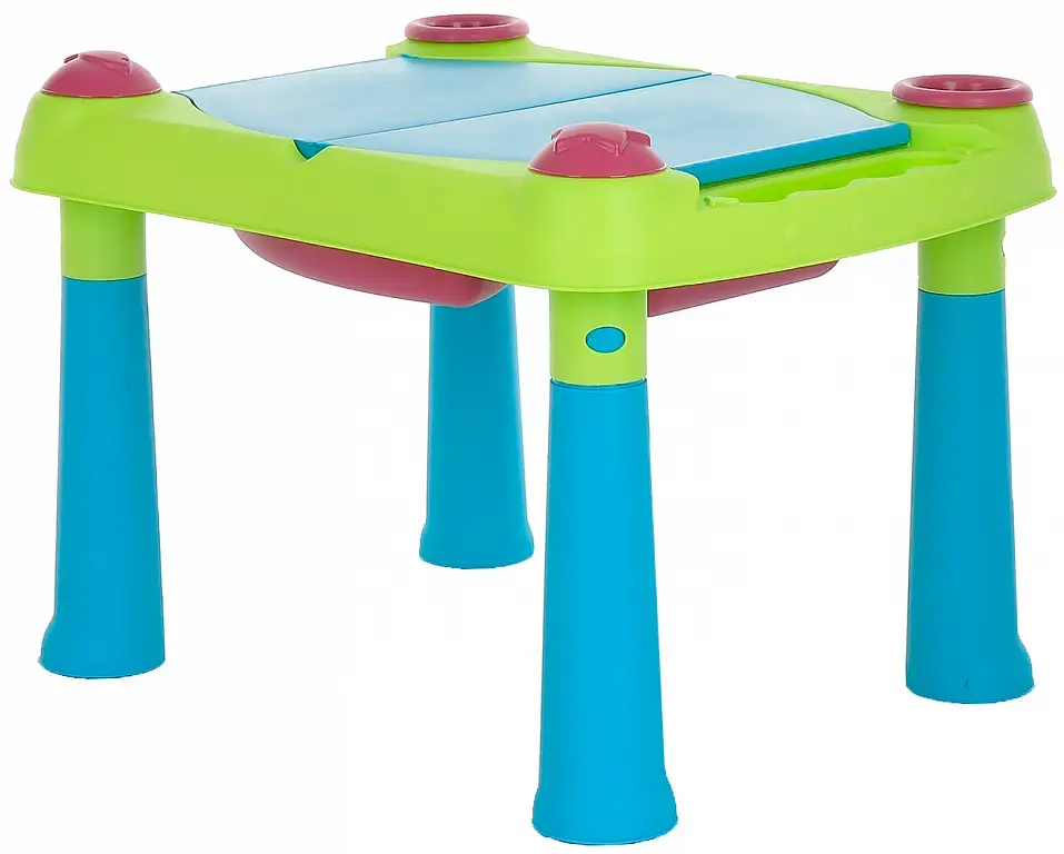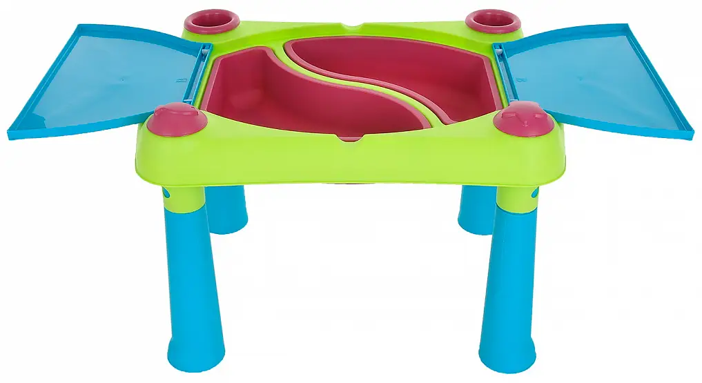 Столик имеет большую игровую поверхность, съёмные резервуары, которые удобно мыть, 2 ёмкости, которые удобно наполнять, а также чашу, решето и формочки, имеющие форму рыбки и звёздочки. 2 открывающиеся крышки защитят содержимое емкостей, вмещающих до 15 л воды или 15 кг песка. Столик оснащен 4 устойчивыми ножками.