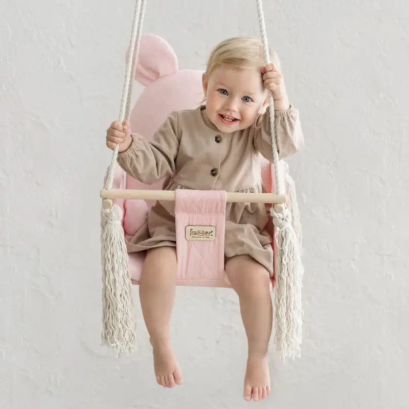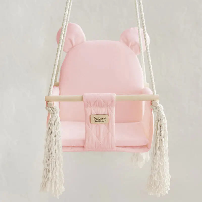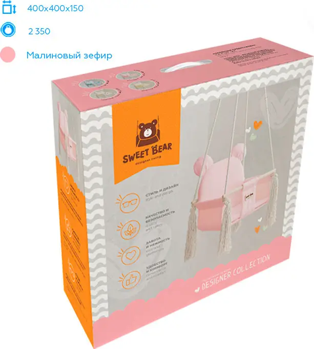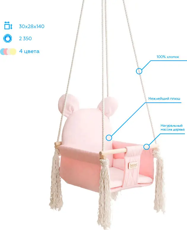 Sweet Bear – коллекция детских качелей, которые несомненно понравятся вашему малышу. Изготовлены из прочного коттона с ромбовой стёжкой, а внутренняя часть из нежнейшего бархатистого плюша. Корпус многослойный – спинка качелей имеет 6 слоёв материалов, а сиденье – 10. С помощью комбинации материалов текстиля, наполнителя и дерева достигается удобство, комфорт и надёжность конструкции. В комплект входит съёмный матрасик для простоты ухода и стирки. Имеется мягкий ремешок безопасности.