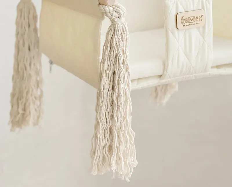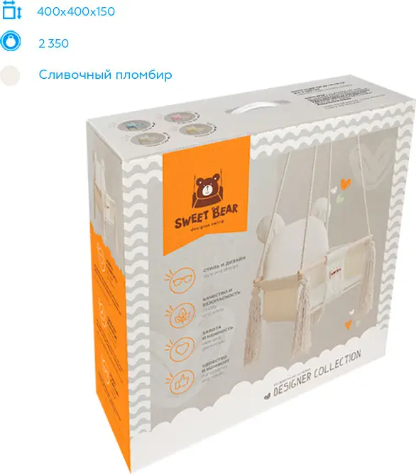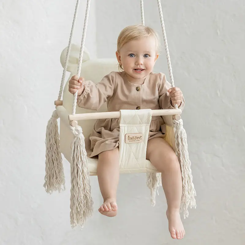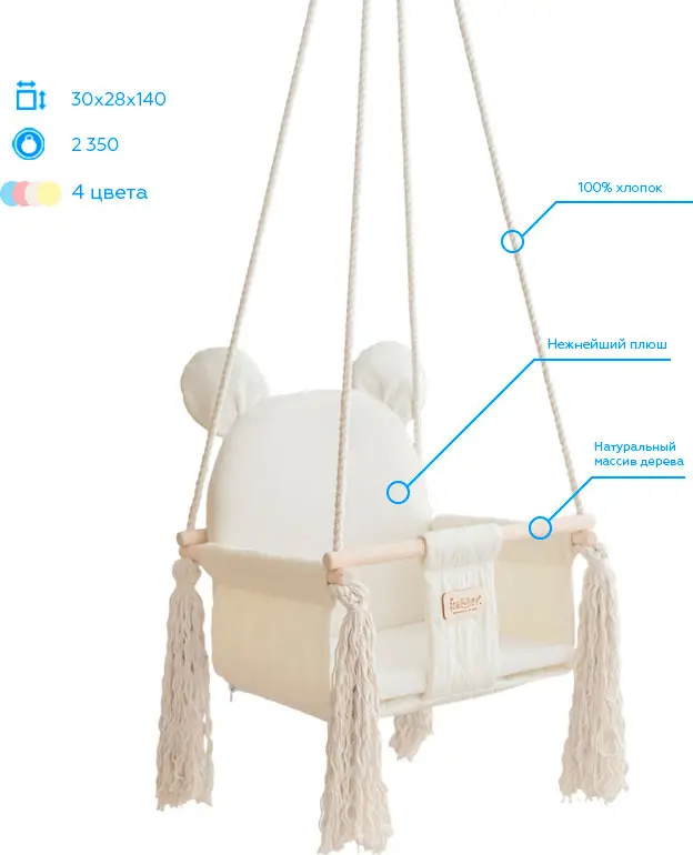 Sweet Bear – коллекция детских качелей, которые несомненно понравятся вашему малышу. Изготовлены из прочного коттона с ромбовой стёжкой, а внутренняя часть из нежнейшего бархатистого плюша. Корпус многослойный – спинка качелей имеет 6 слоёв материалов, а сиденье – 10. С помощью комбинации материалов текстиля, наполнителя и дерева достигается удобство, комфорт и надёжность конструкции. В комплект входит съёмный матрасик для простоты ухода и стирки. Имеется мягкий ремешок безопасности.