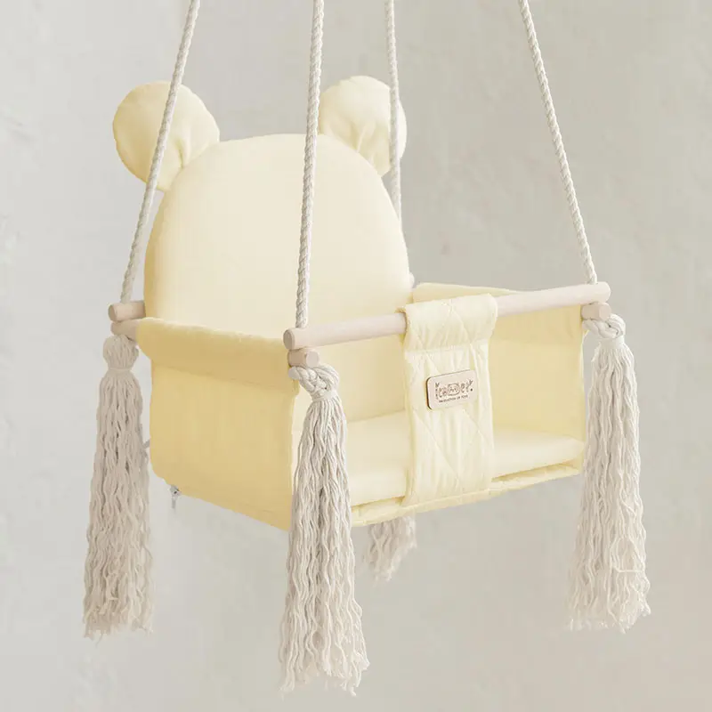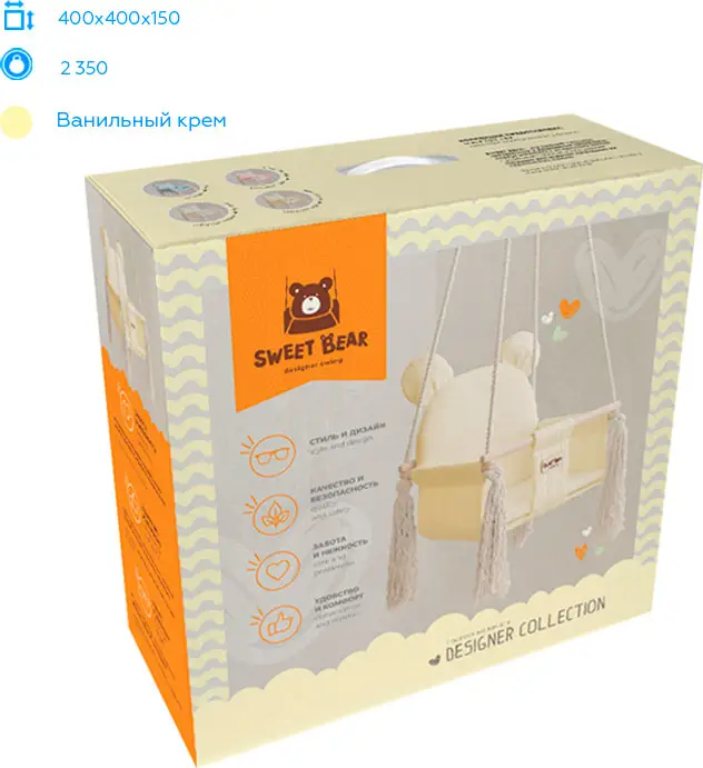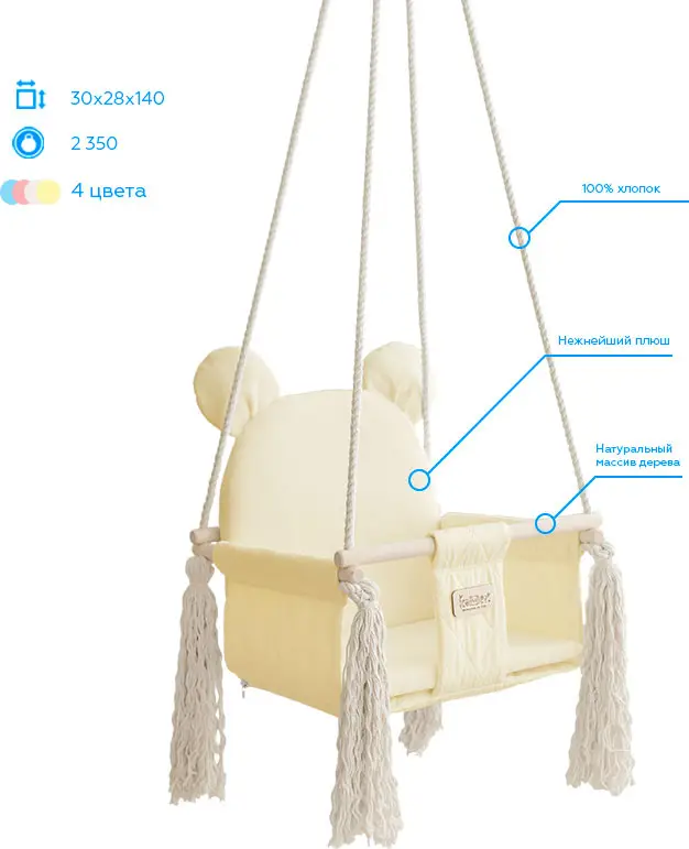 Sweet Bear – коллекция детских качелей, которые несомненно понравятся вашему малышу. Изготовлены из прочного коттона с ромбовой стёжкой, а внутренняя часть из нежнейшего бархатистого плюша. Корпус многослойный – спинка качелей имеет 6 слоёв материалов, а сиденье – 10. С помощью комбинации материалов текстиля, наполнителя и дерева достигается удобство, комфорт и надёжность конструкции. В комплект входит съёмный матрасик для простоты ухода и стирки. Имеется мягкий ремешок безопасности.