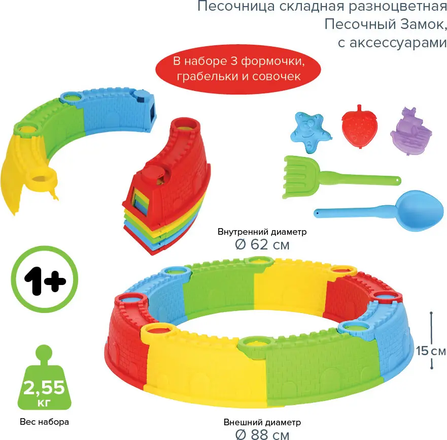 Песочница «Песочный Замок» представляет собой восемь элементов разных цветов, которые скрепляются между собой и образуют круг. Восемь элементов, выполненных из высококачественных материалов, могут быть использованы отдельно и позволят создавать маленьким архитекторам великолепные скульптуры из песка. В набор также входят 3 формочки, грабельки и совочек. После прекращения игры песочница компактно размещается в упаковке. Её можно собирать и разбирать. Песочница компактно хранится в собранном виде.