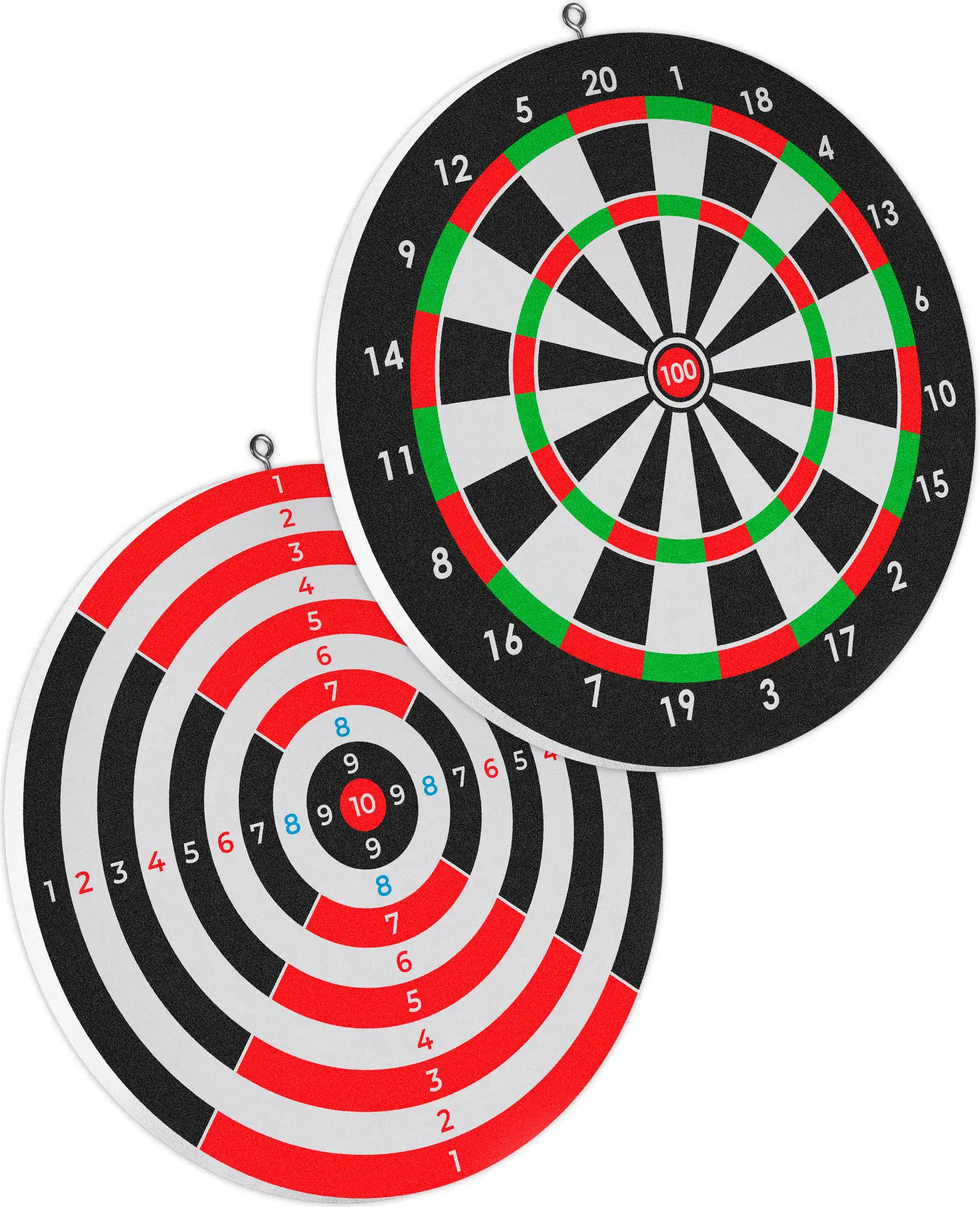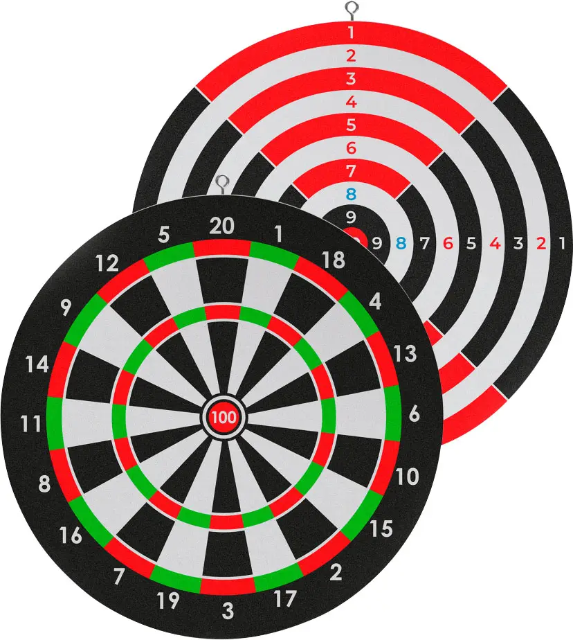 В набор для игры в дартс входит мишень из прочного и упругого материала с двусторонней печатью и 2 дротика.
