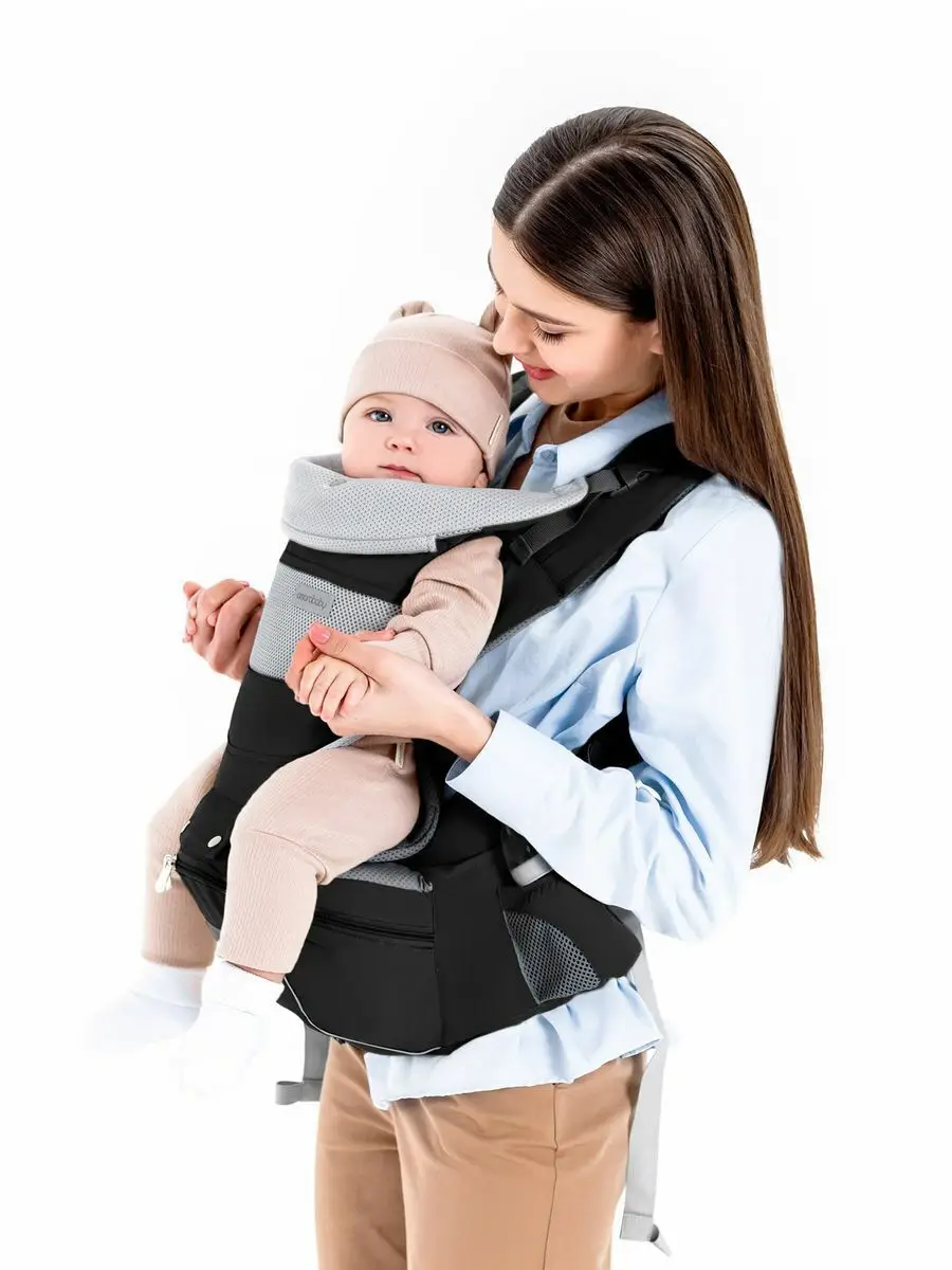 Переноска Carry от бренда Amarobaby многофункциональна, можно использовать как переноску для новорождённых в положении лёжа, эргорюкзак или хипсит.