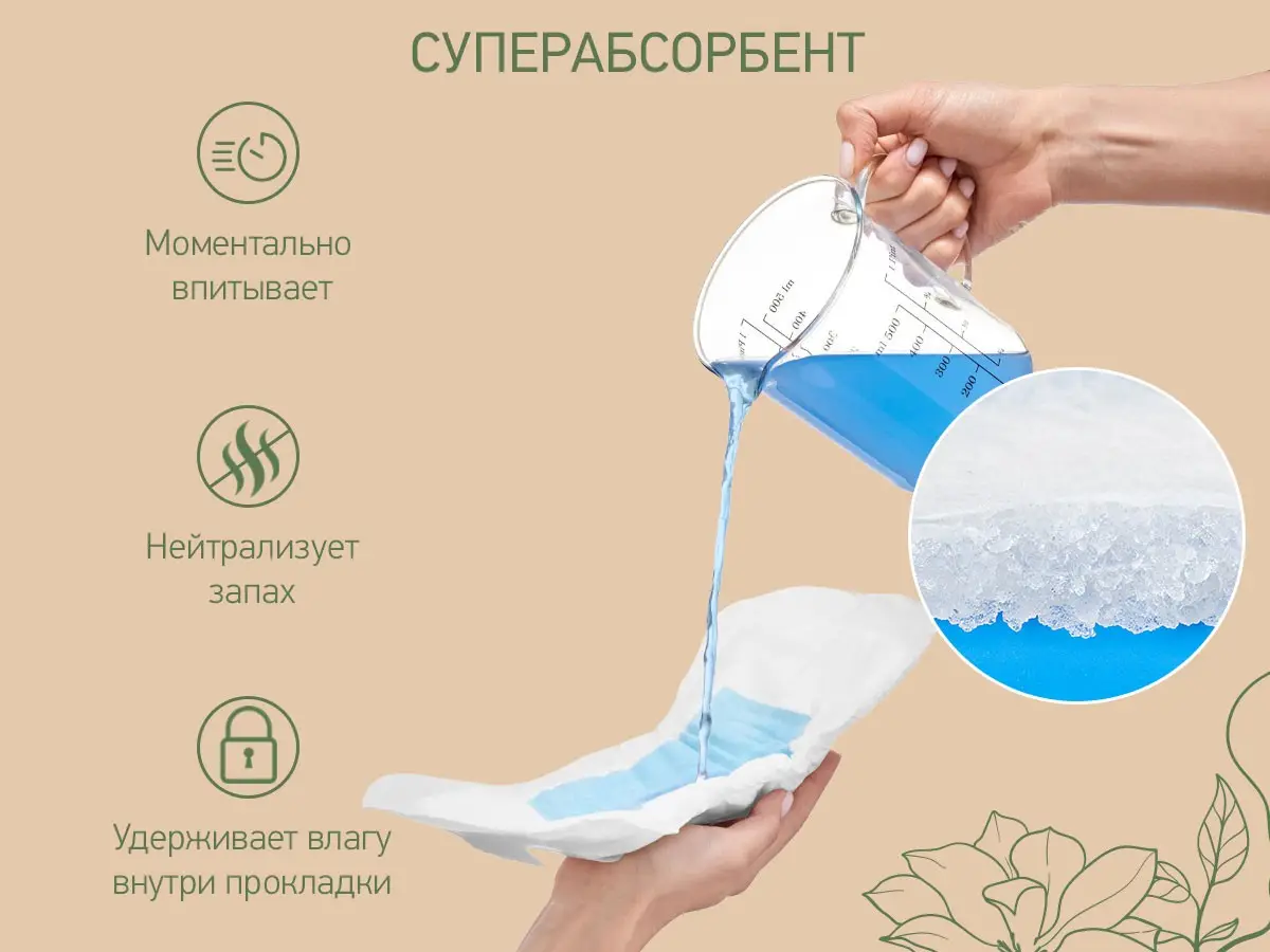 Суперабсорбент моментально превращает жидкость в гель и нейтрализует запах, а эластичные бортики по краям прокладки предотвращают протекани...