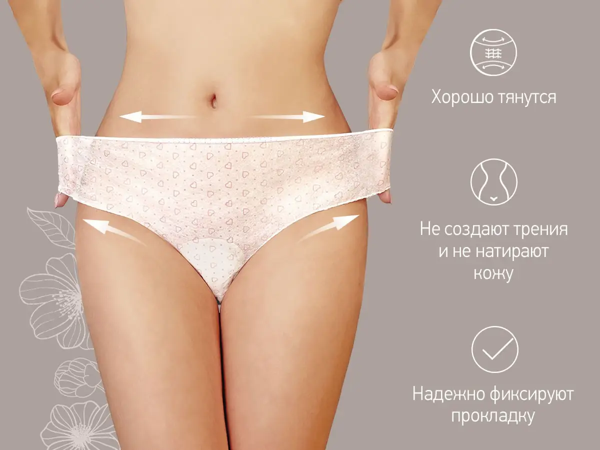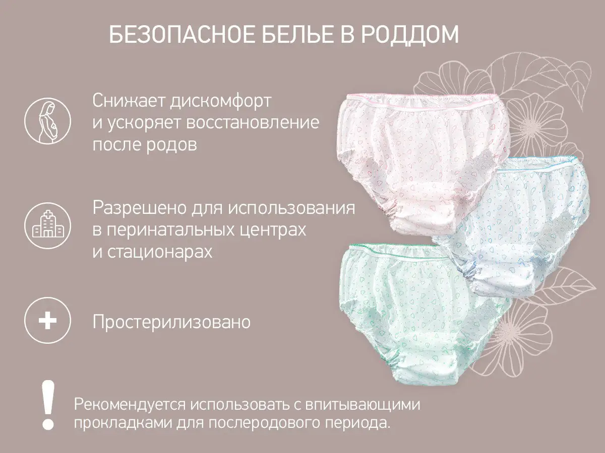 Выполнены из медицинского спанбонда, который сочетает дышащие свойства и высокое сцепление с клеевым слоем послеродовой прокладки. Предназначено для ношения в роддомах, перинатальных центрах и других стационарах, где инфекционной безопасности уделяется особое внимание, а также дома.