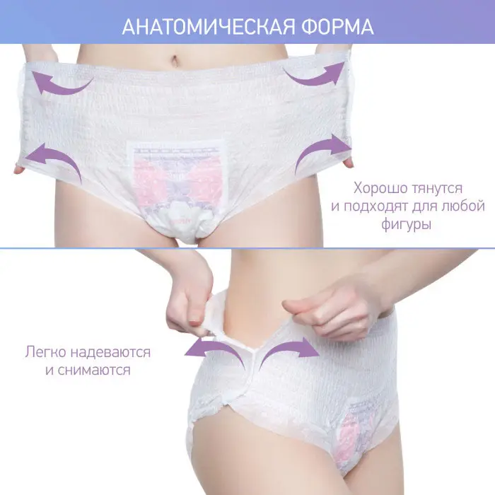 Изделие адаптируется под фигуру и остается незаметным под одеждой. Трусы легко надеваются и имеют утягивающий эффект. Хлопковая текстура позволит коже дышать, а тонкая ткань и мягкие швы будут ощущаться как хлопковое нижнее белье. Дизайн трусов повторяет анатомические особенности тела. Высокие бортики обеспечат защиту от протекания со всех сторон. Гигиеническая прокладка длиной 36 см впитывает до 400 мл влаги. Впитывающий слой из суперабсорбента и целлюлозной ваты моментально превращается в гель – это позволяет надежно удержать жидкость внутри прокладки и сохранить сухость и комфорт.